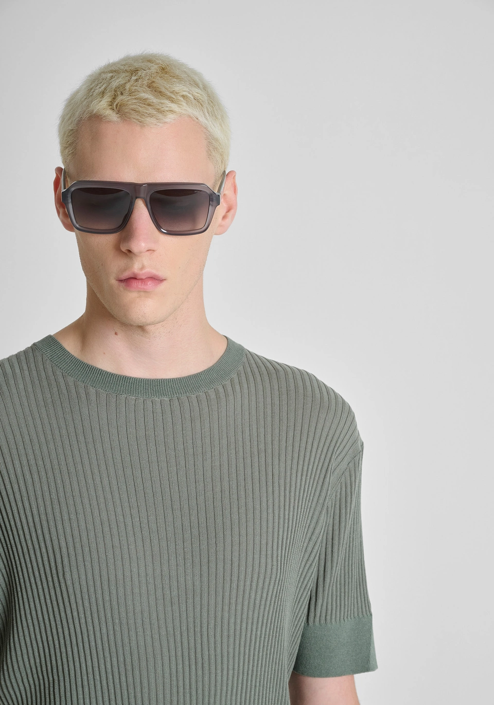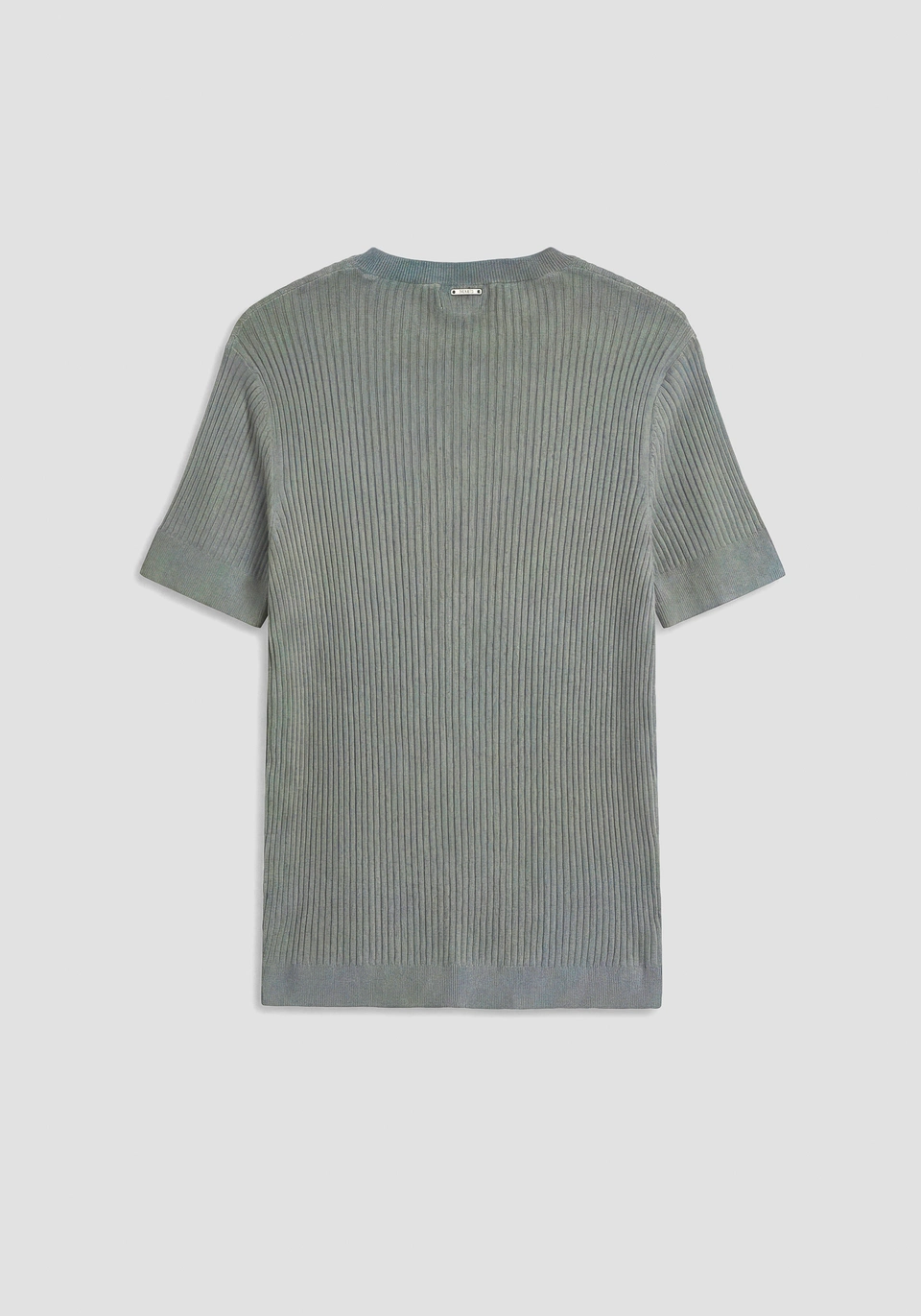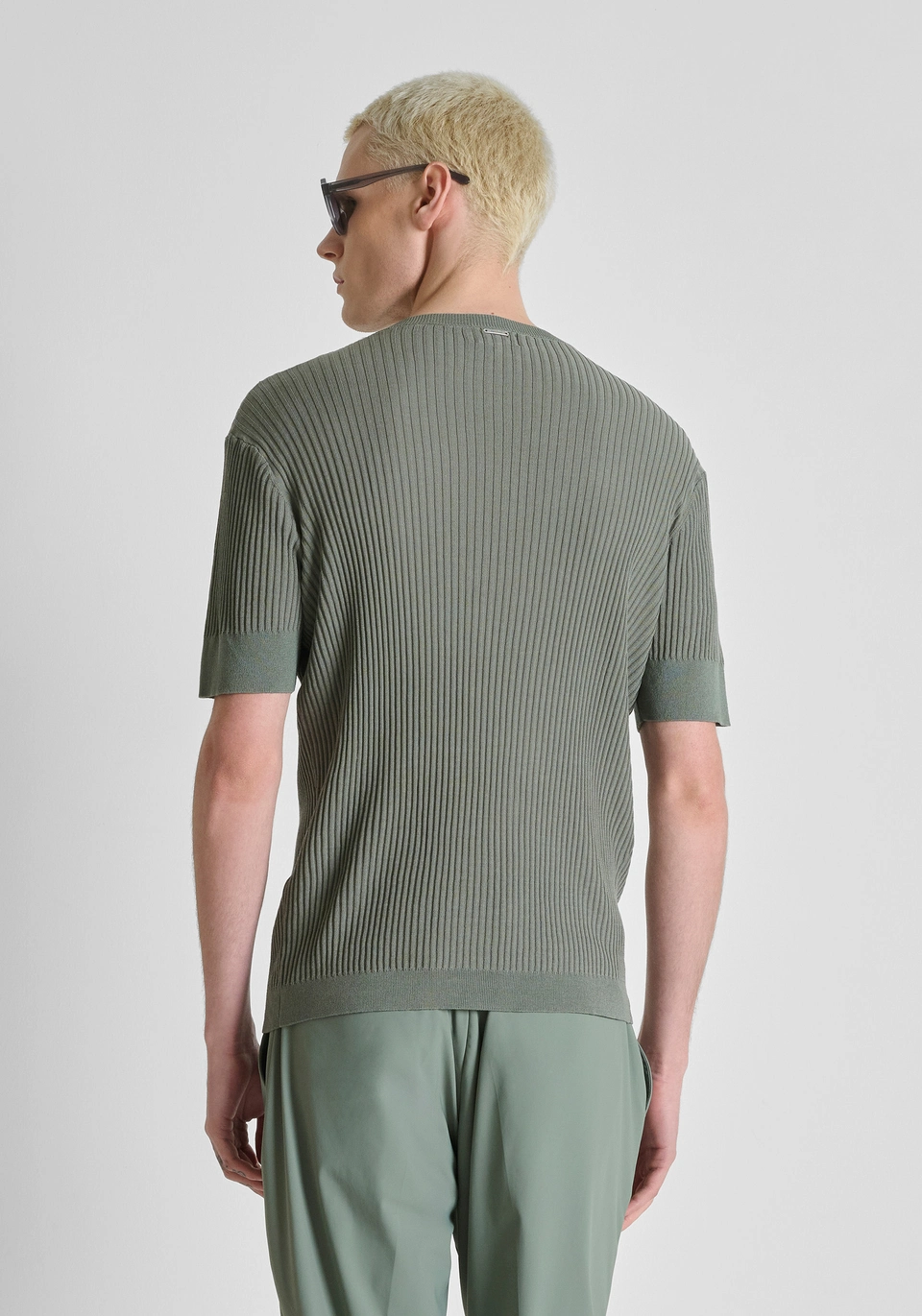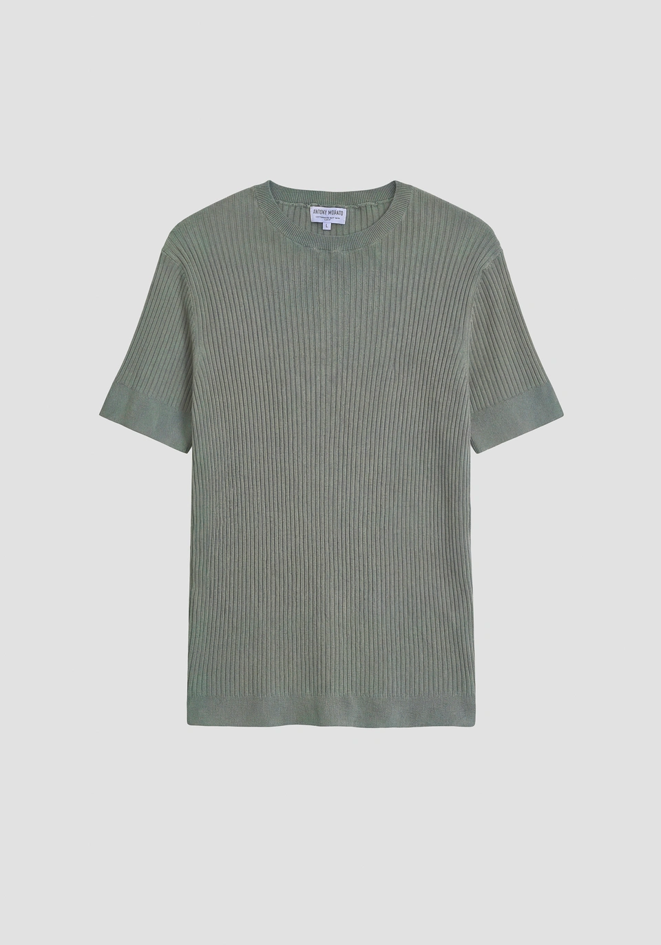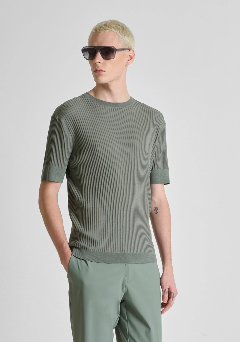 Camisola verde militar canelada da Antony Morato com design minimalista e elegante, ideal para looks urbanos e coordenados sofisticados. A textura canelada confere estrutura à peça e valoriza a silhueta, criando uma leitura moderna e intemporal.