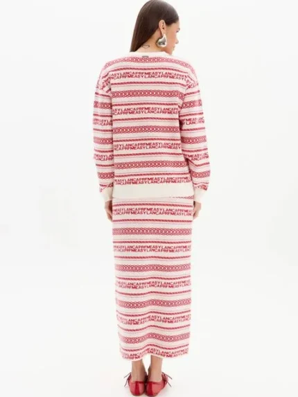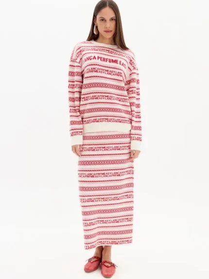 Camisola justa de manga longa na cor vermelha, com um design diferenciado no busto, incluindo babados e detalhes de botões no centro. A blusa tem um toque moderno e ousado.
