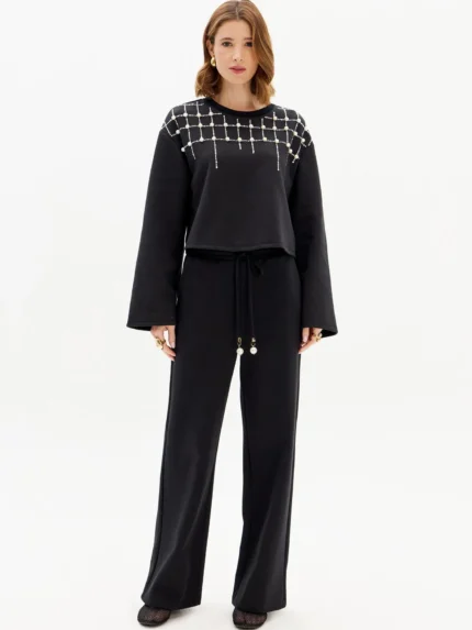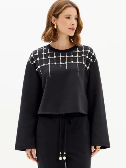 SWEATSHIRT PRETA COM APLICAÇÃO DE PÉROLAS LANÇA PERFUME