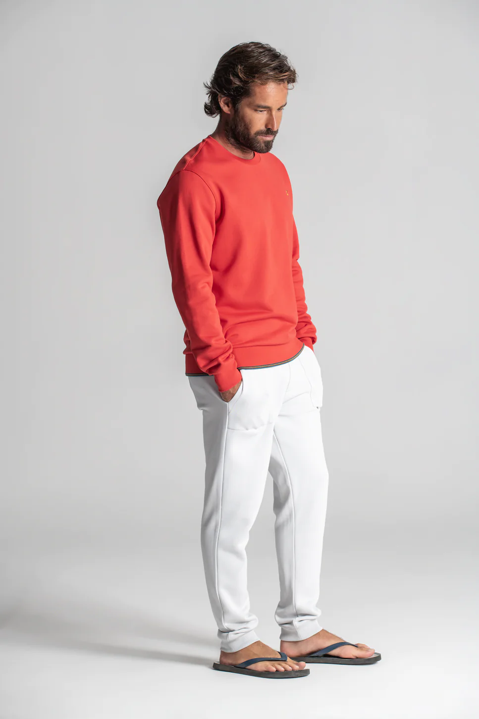 Modelo de corte clássico com gola redonda e acabamentos canelados na gola, punhos e base, garantindo um ajuste confortável. Destaca-se pelo detalhe de contraste na gola interior e pelo logótipo JEF bordado no peito, que reforça a identidade da marca com um toque discreto e sofisticado.