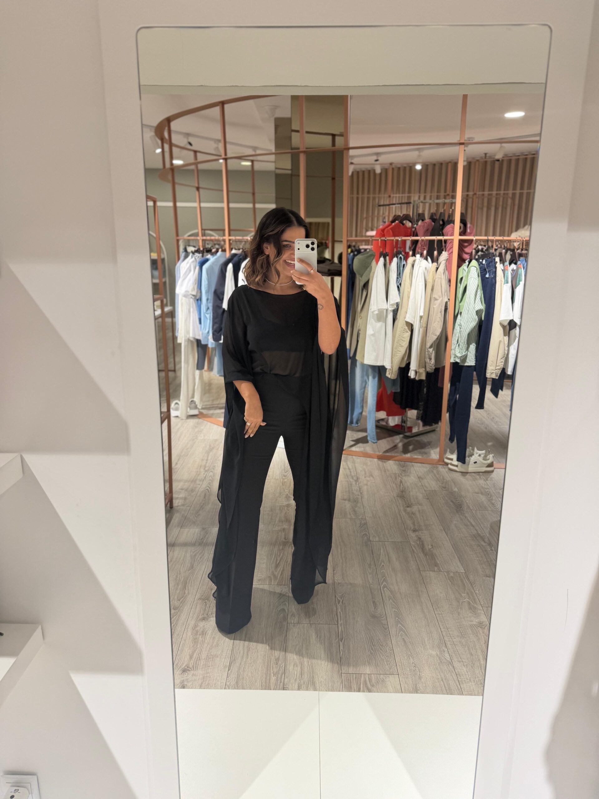 Esta capa preta Ponto Chic destaca-se pela sua leveza e elegância minimalista, sendo a peça ideal para complementar looks com sofisticação e fluidez. Confeccionada em 100% poliéster, apresenta um tecido leve e translúcido que cria movimento e um efeito visual delicado.