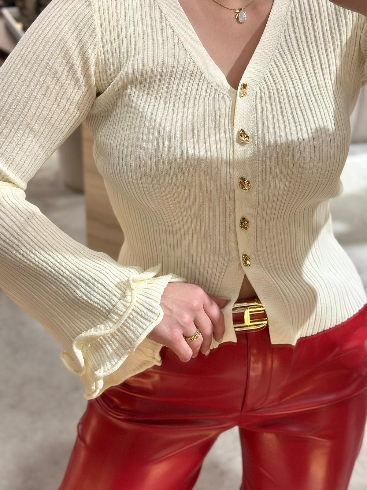 Com abertura frontal e botões metálicos em forma de coração, este modelo apresenta um design romântico e delicado. A malha canelada confere textura e elegância, enquanto o acabamento ondulado nas mangas e na base acrescenta um detalhe moderno e diferenciador.