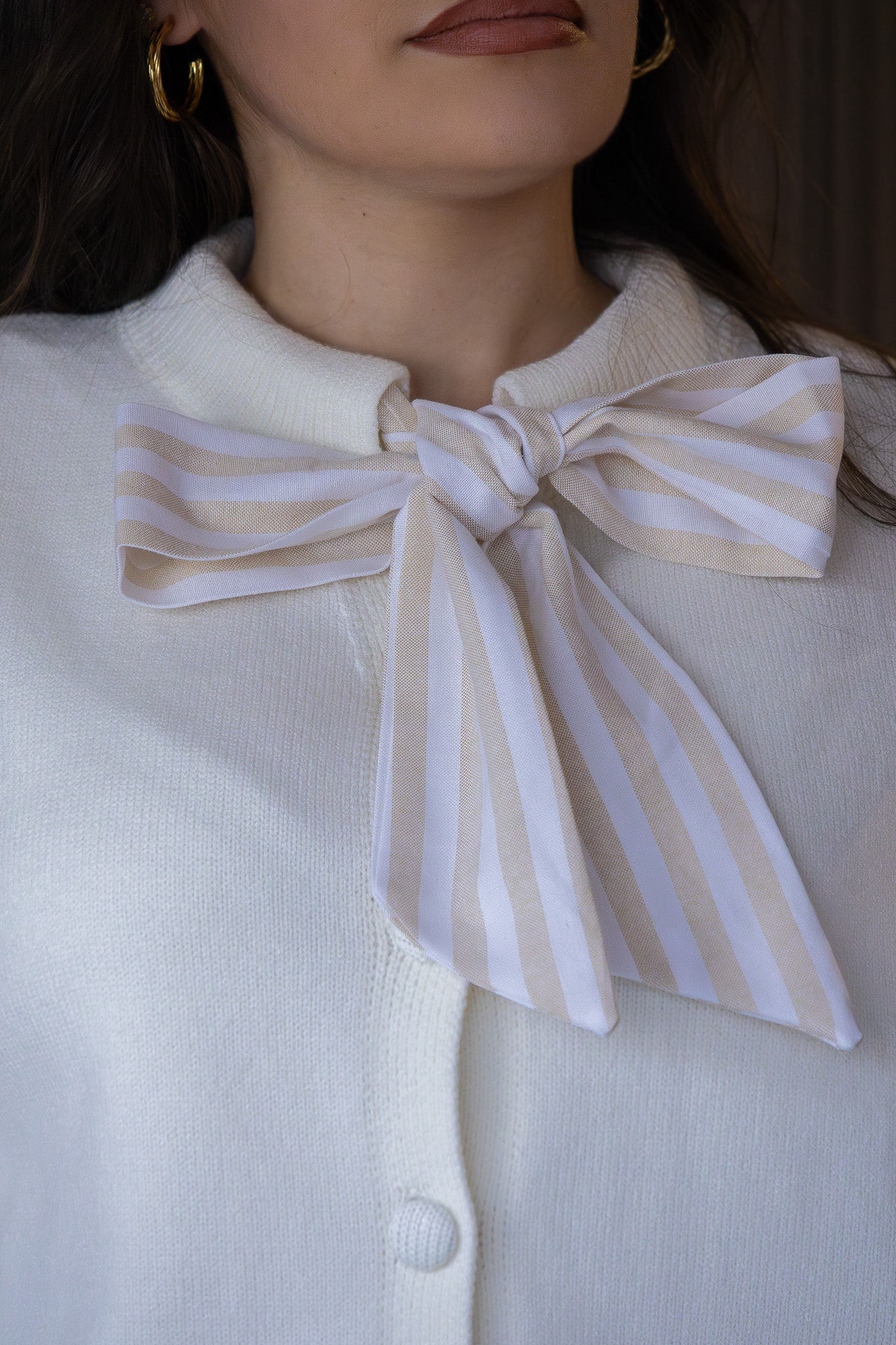 Destaca-se pelo laço decorativo no decote, em fita de padrão riscado, que acrescenta um detalhe romântico e diferenciador à peça. O fecho frontal com botões forrados confere um acabamento elegante e harmonioso, mantendo uma estética clean e intemporal. As mangas curtas com ligeiro volume nos ombros criam uma silhueta feminina e estruturada, valorizando a linha dos ombros e do tronco.