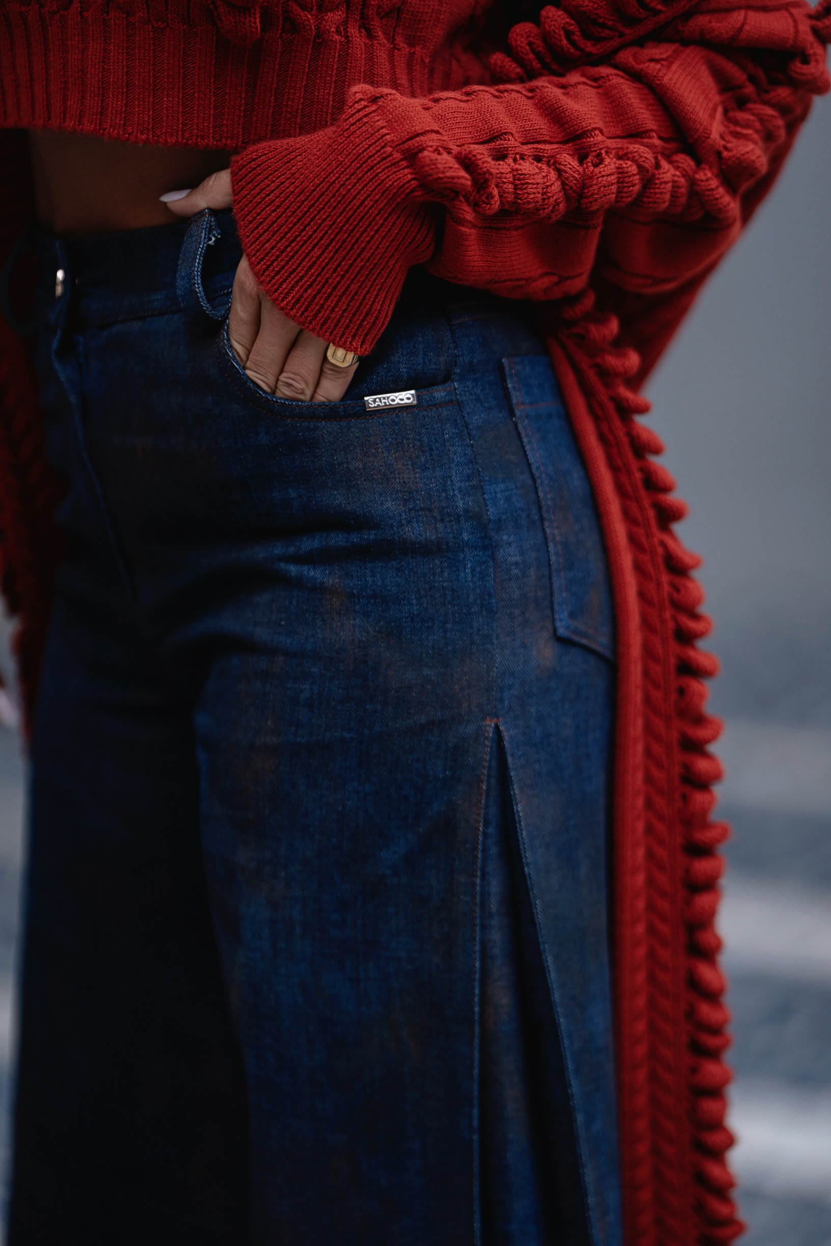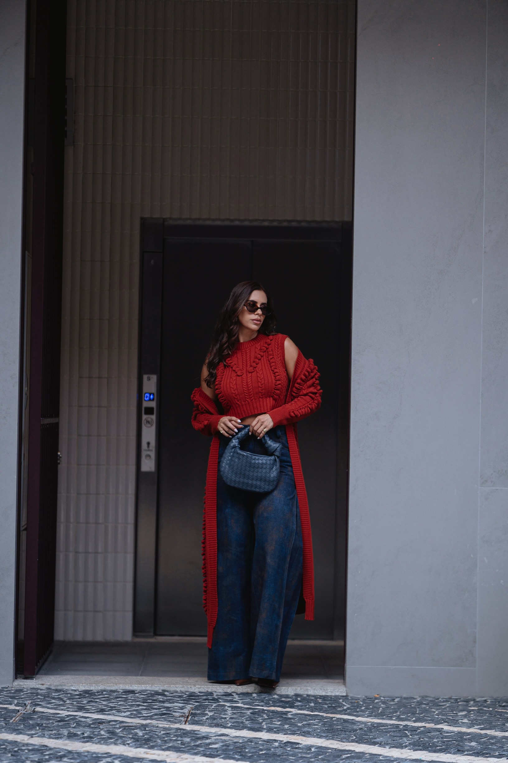 Este cardigan em tricô Sahoco, produzido em 100% acrílico, apresenta um design longo e envolvente, marcado por relevos estruturados que conferem textura, volume e um toque artesanal à peça. O tom terra acrescenta profundidade e modernidade, tornando-o uma escolha versátil para coordenados de outono-inverno.