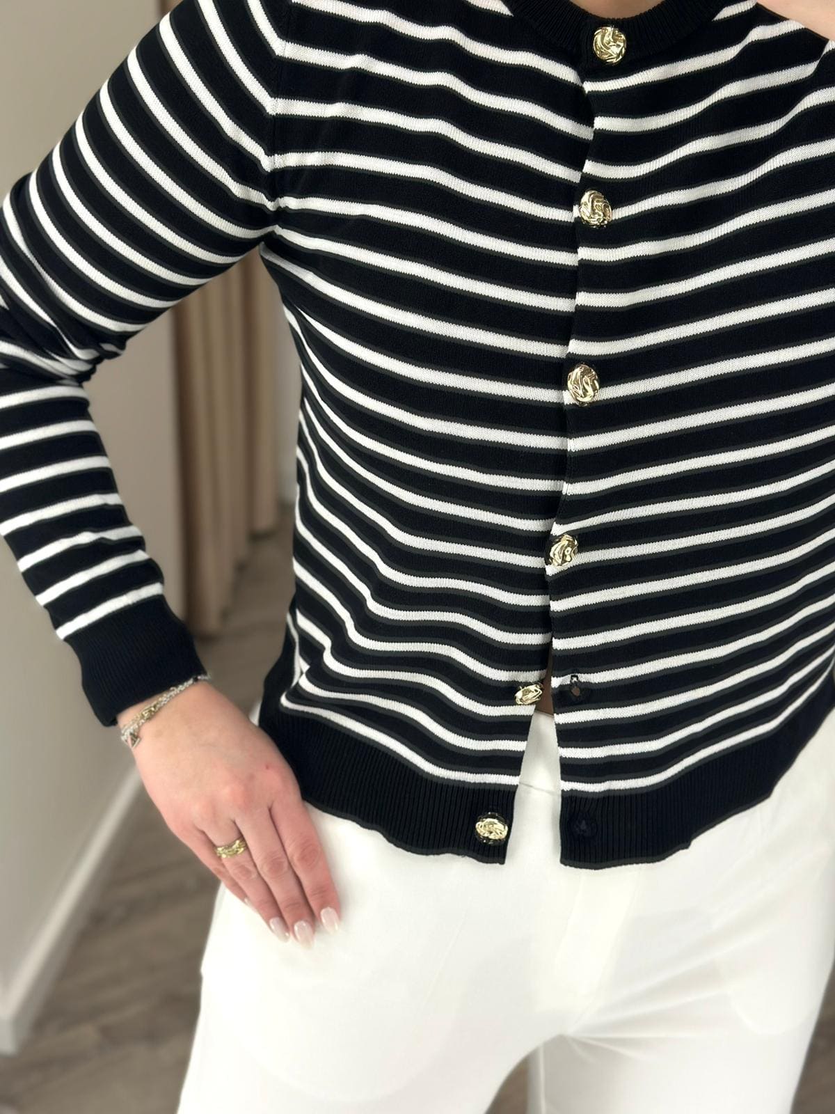 CARDIGAN PRETO E BRANCO ÀS RISCAS COM BOTÕES DOURADOS PONTO CHIC