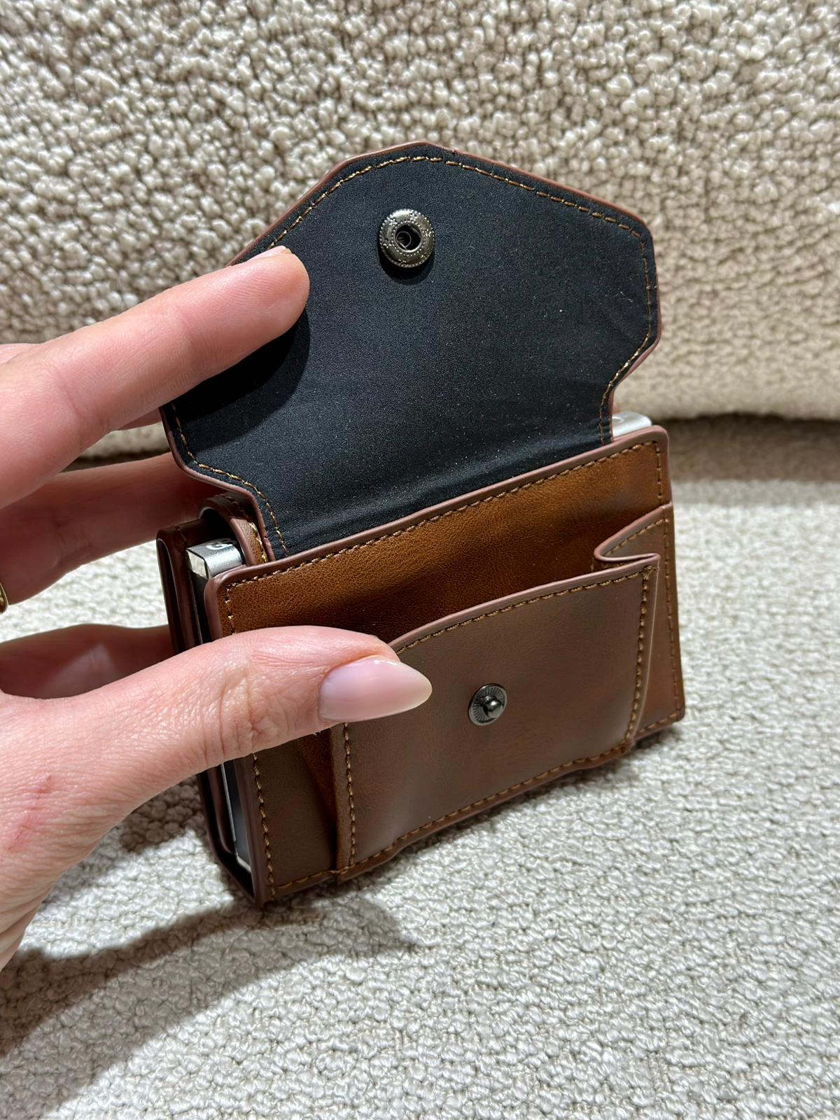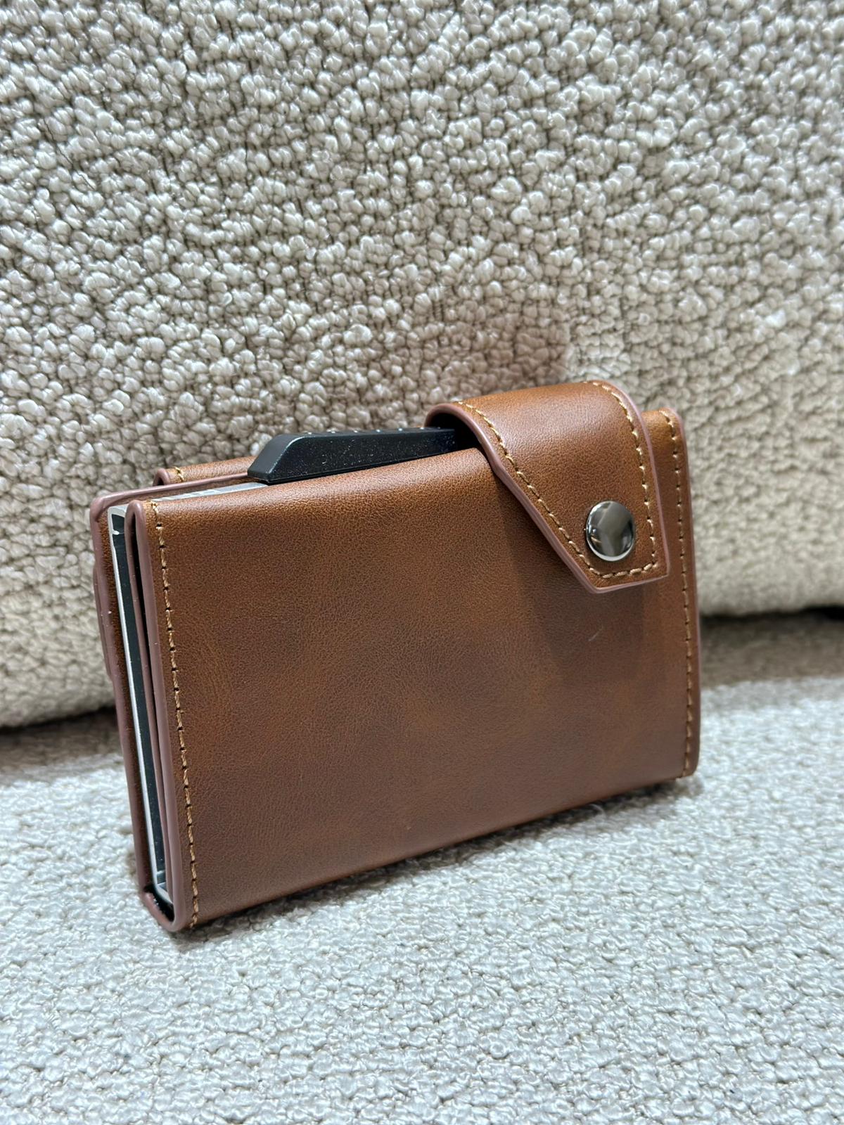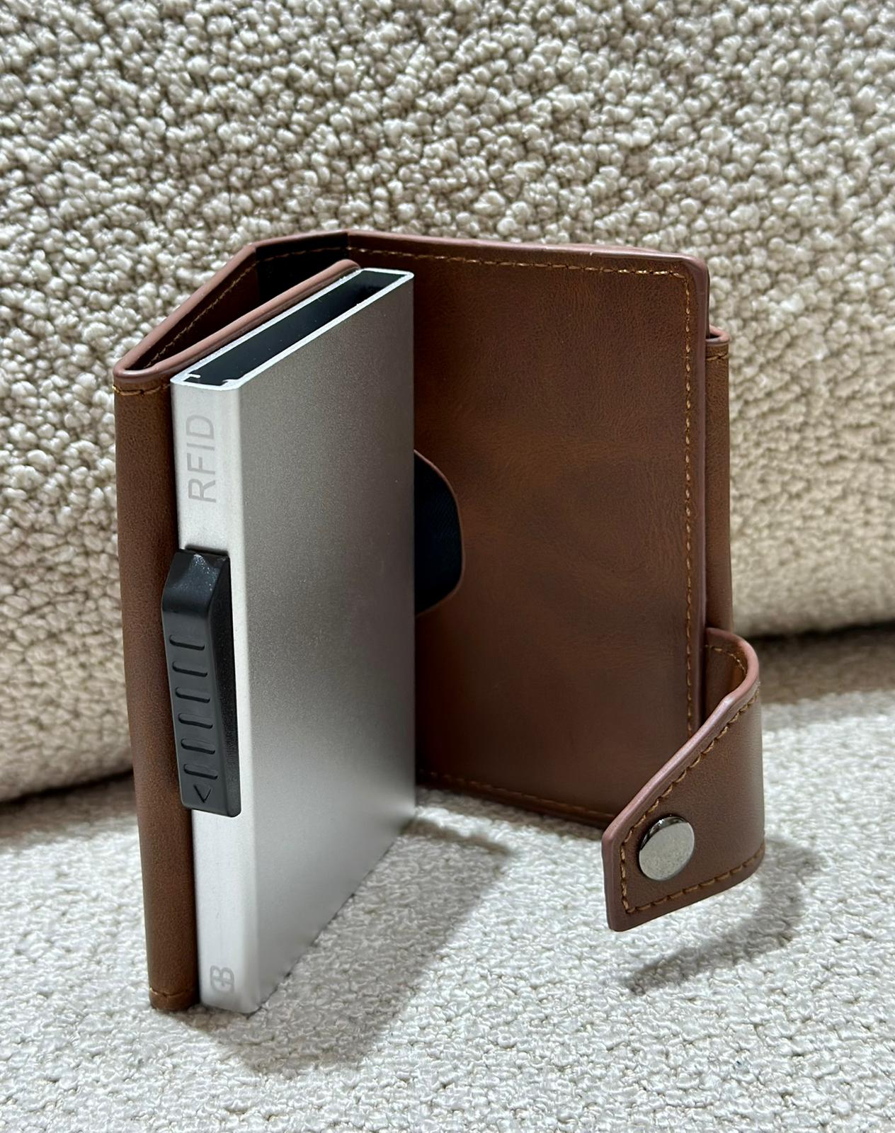 Com interior estruturado em alumínio, esta carteira mantém os teus cartões organizados, protegidos e sempre acessíveis com um simples movimento.