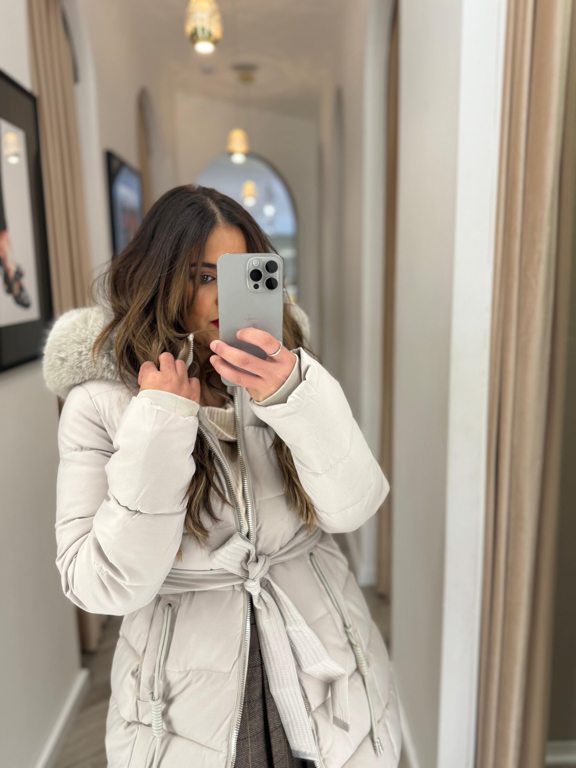 O design distingue-se pelo capuz volumoso com pelo macio e removível, que acrescenta um toque luxuoso e feminino à peça. A estrutura acolchoada em painéis amplos garante um caimento confortável e envolvente, enquanto o fecho frontal metálico traz um apontamento contemporâneo. O cinto ajustável na zona da cintura permite definir a silhueta, criando um visual mais elegante e estruturado.