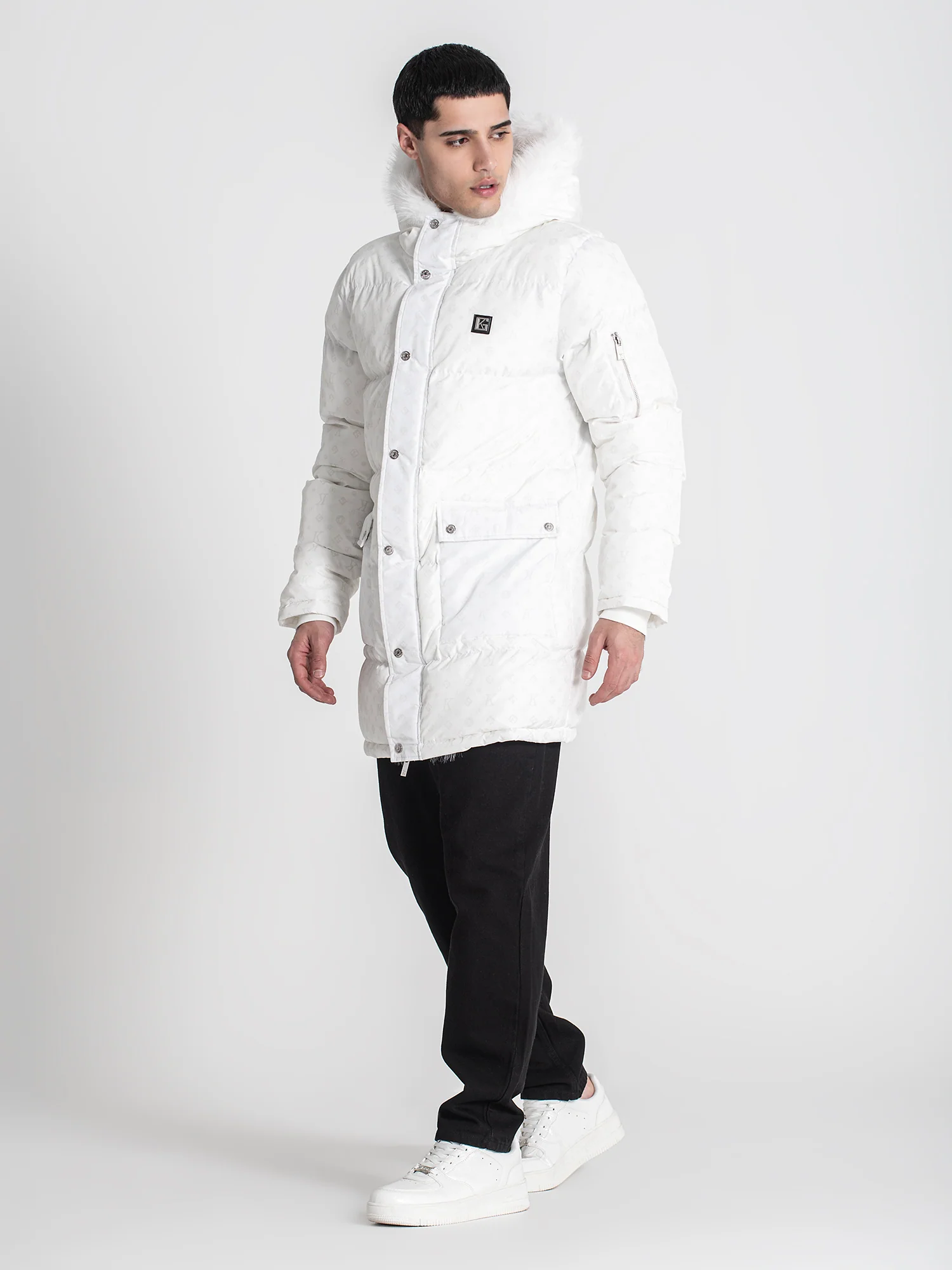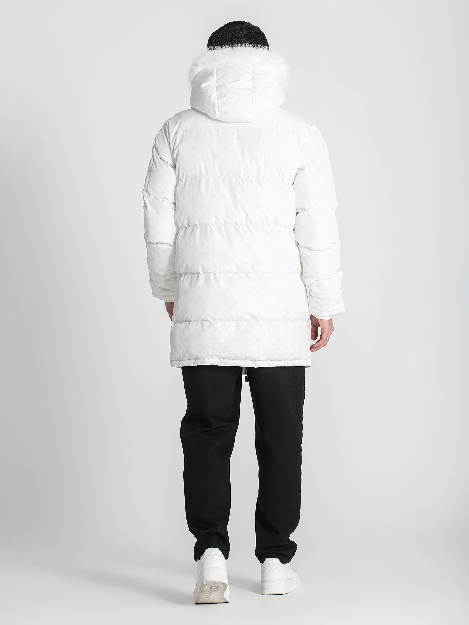 O design destaca-se pelo padrão monograma subtil em toda a peça e pelo capuz forrado em pelo branco, que acrescenta sofisticação e modernidade. Os bolsos frontais funcionais com botões de pressão e a estrutura acolchoada garantem praticidade sem comprometer o impacto visual.