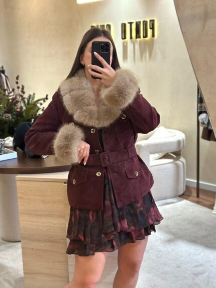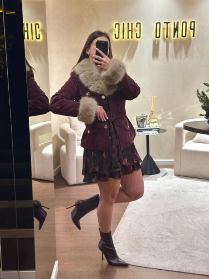 CASACO BORDÔ COM PELO E CINTO PONTO CHIC