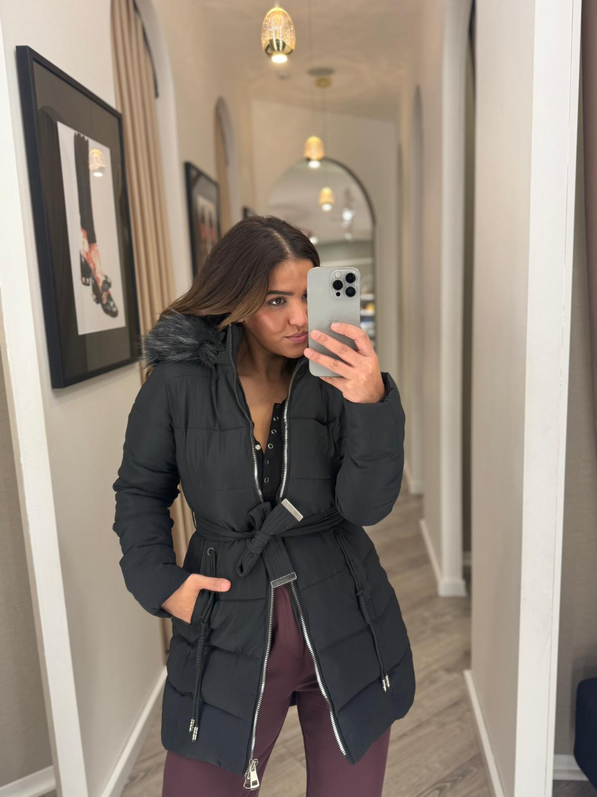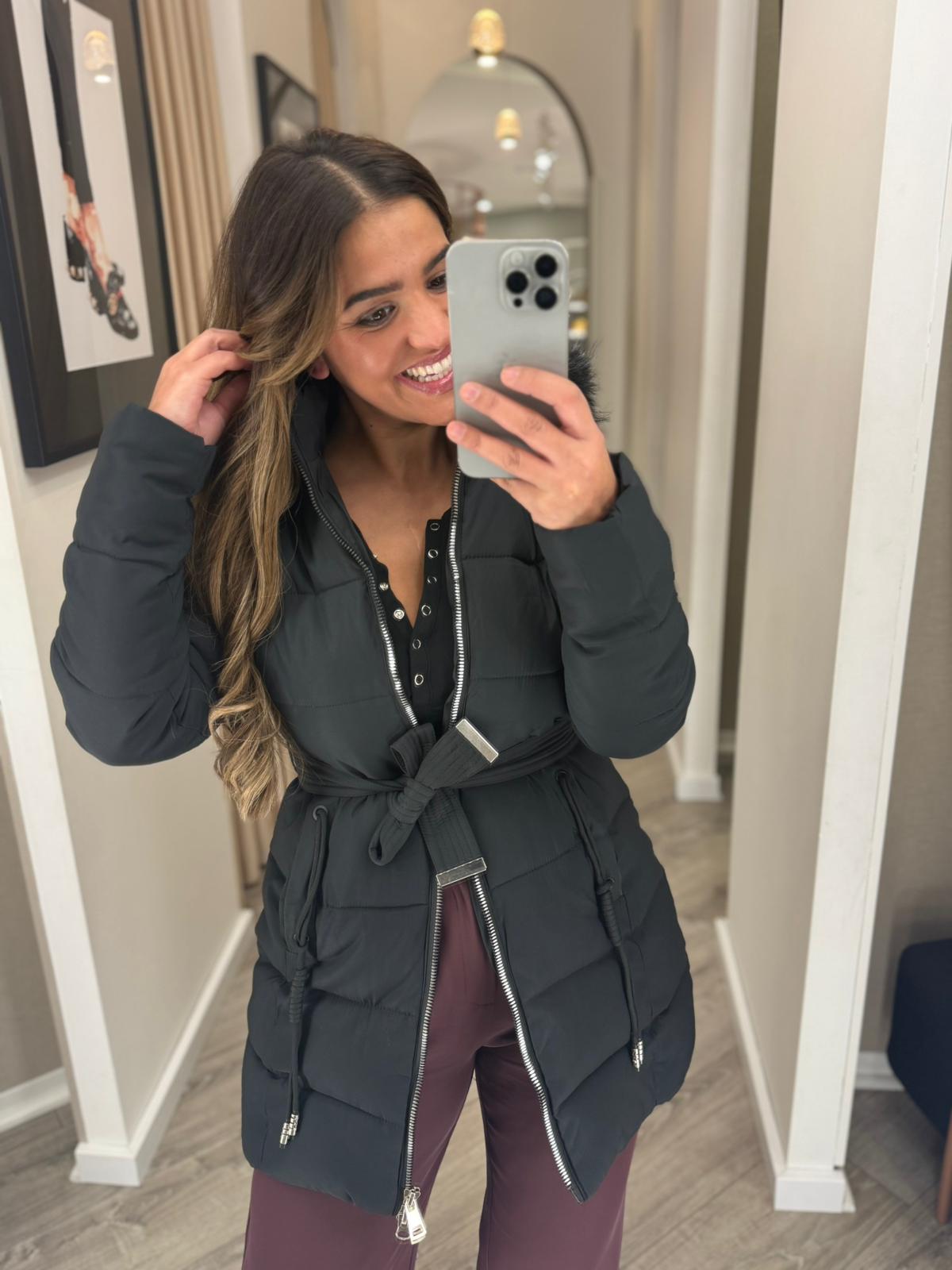 CASACO ACOLCHOADO PRETO COM CINTO PONTO CHIC