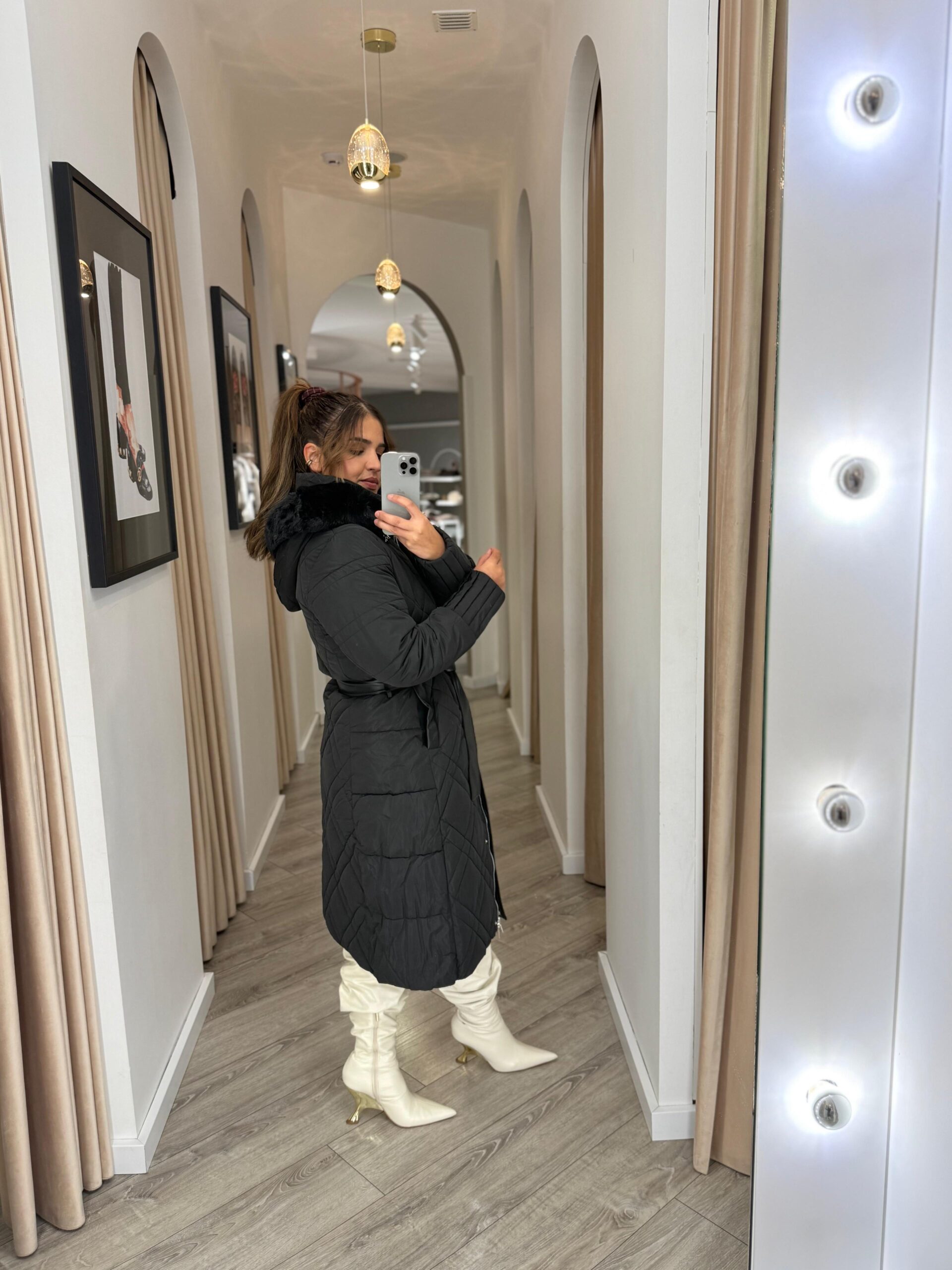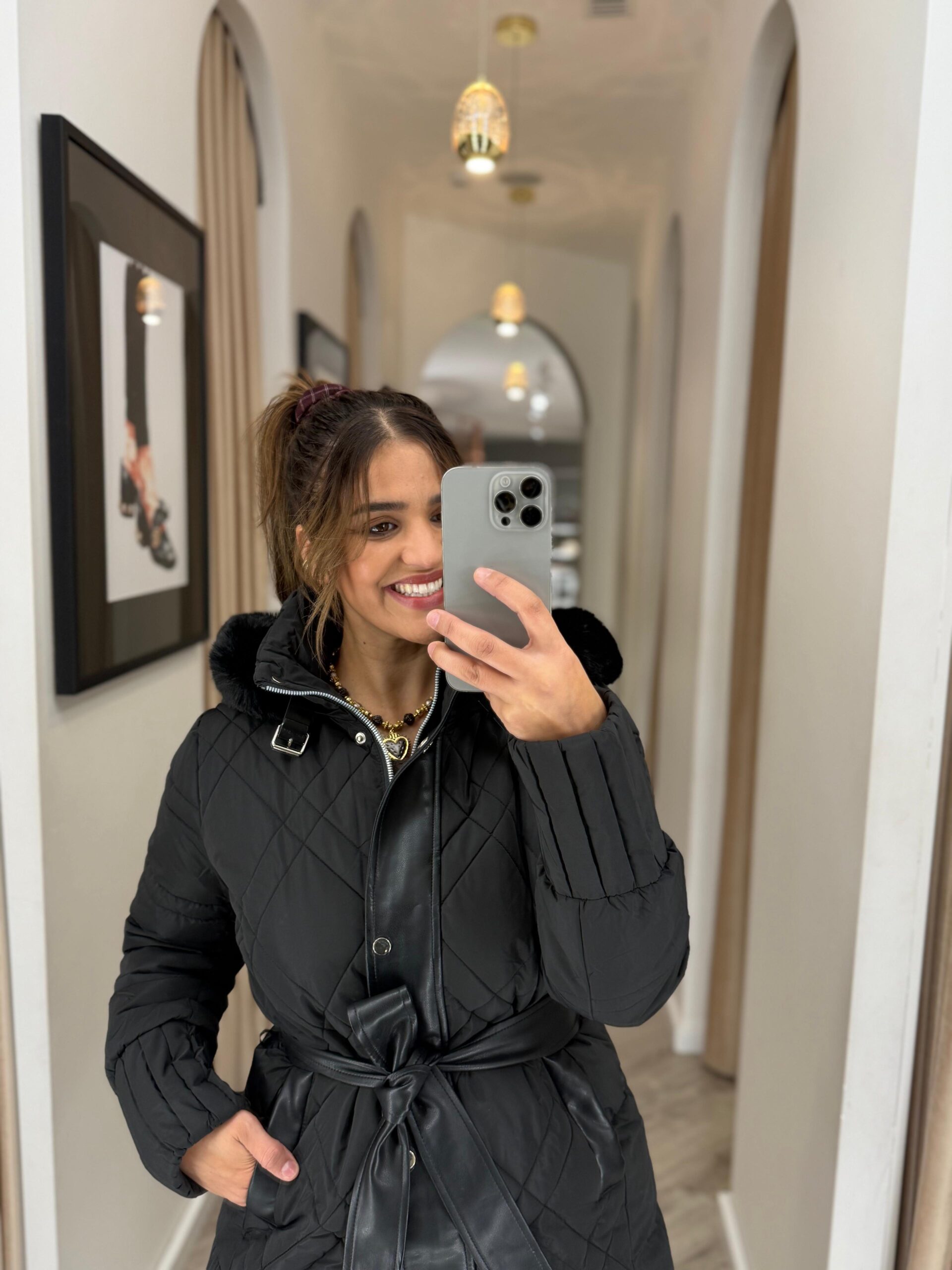 Combinando estilo urbano e sofisticação, o casaco acolchoado preto com pelo Ponto Chic adapta-se facilmente a qualquer ocasião — perfeito para looks de inverno elegantes, seja com botas e malhas ou com coordenados mais formais.
