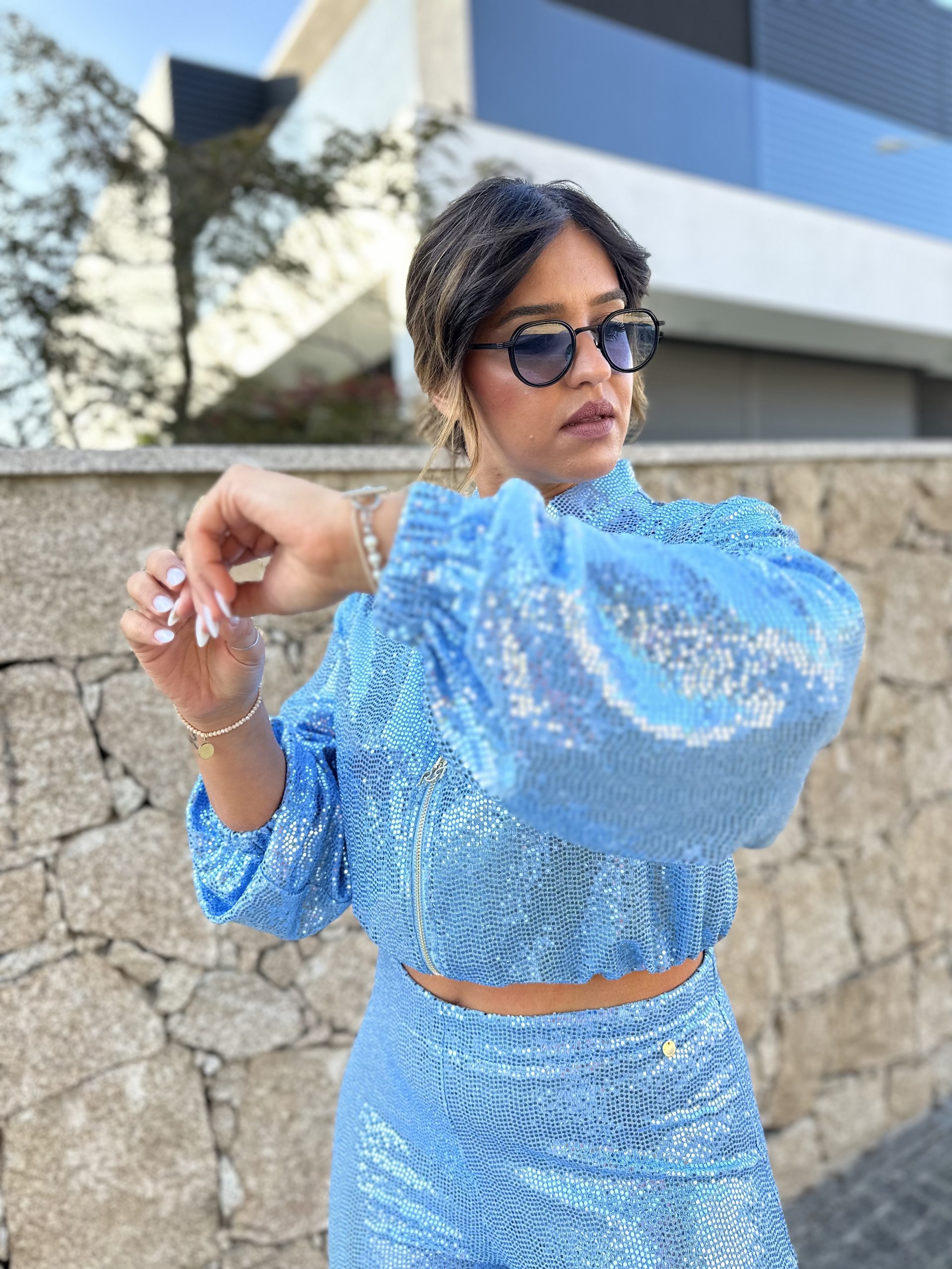 Com corte tipo bomber curto, fecho frontal em zíper dourado e elástico discreto na base, o casaco equilibra a leveza do brilho com uma estrutura contemporânea e sofisticada. A textura metálica do tecido azul bebé transforma-o numa peça de impacto, sem perder o conforto nem a fluidez.