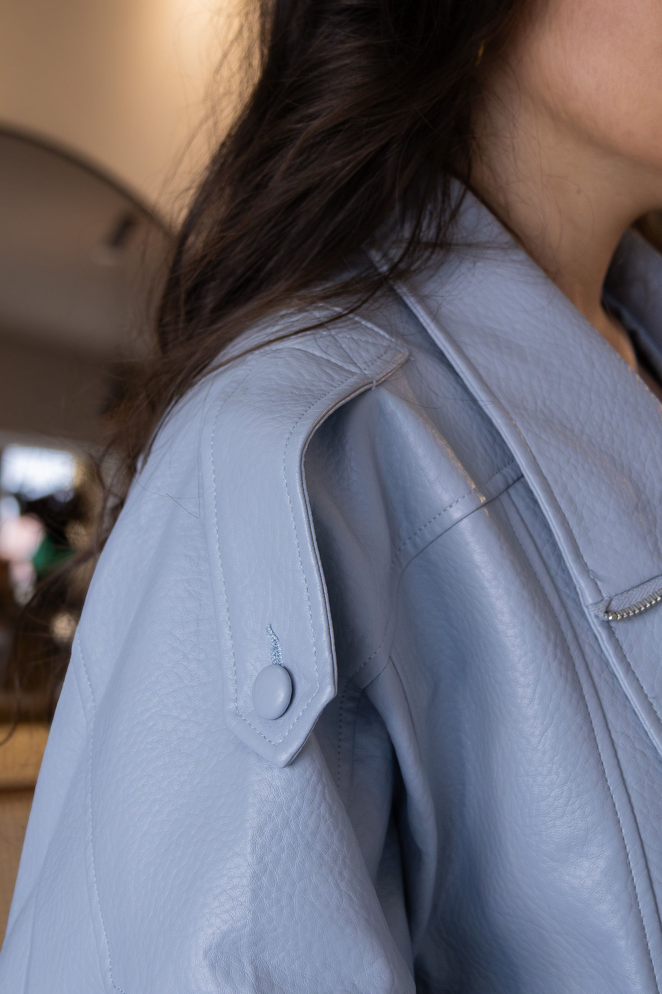 Este casaco azul em pele sintética destaca-se pelo seu design contemporâneo e sofisticado, inspirado no estilo biker, com fecho assimétrico frontal que confere atitude e personalidade ao look. A textura levemente granulada do material acrescenta profundidade visual, enquanto o corte estruturado valoriza a silhueta de forma elegante e moderna.