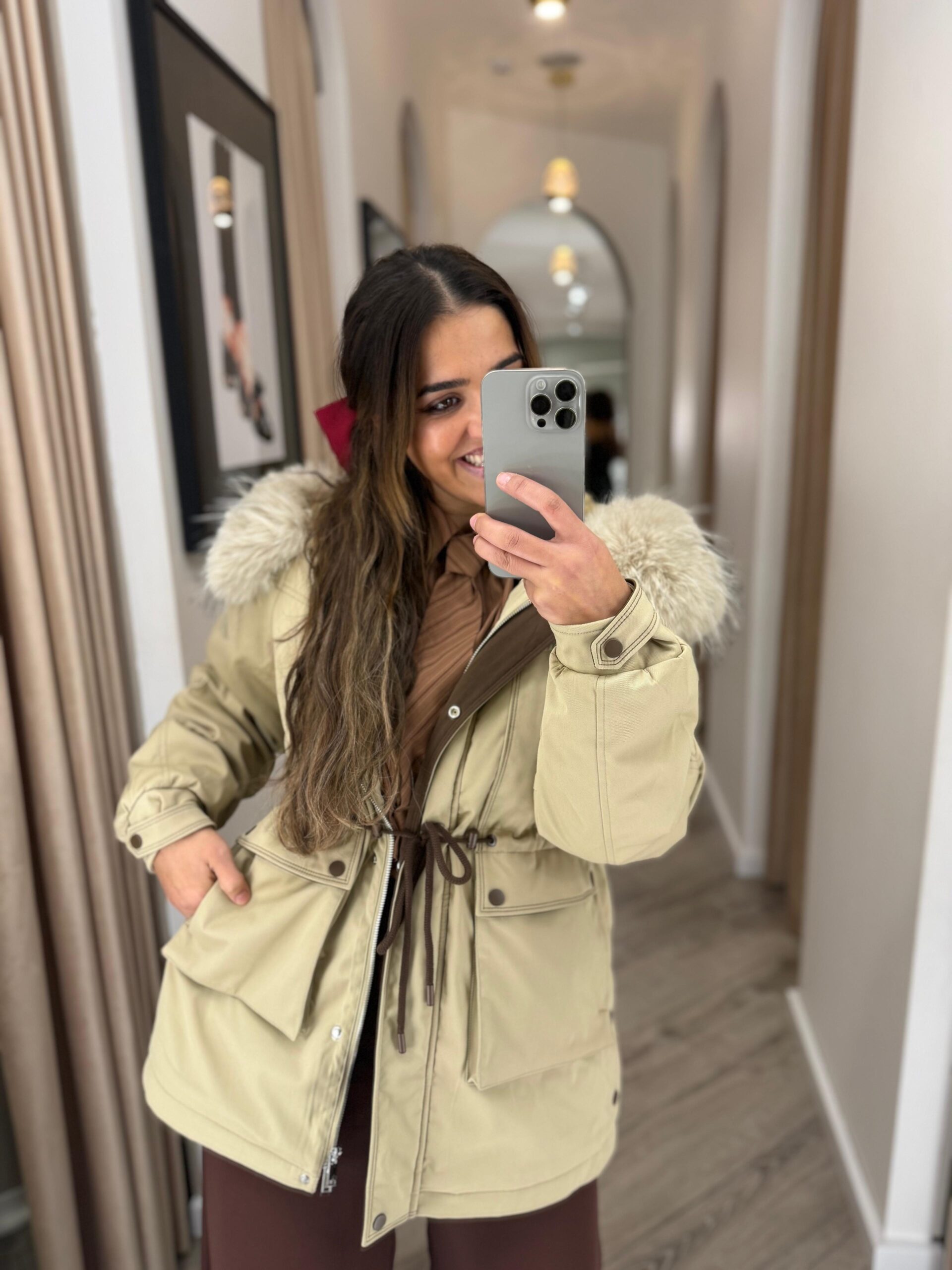 O design destaca-se pelo capuz adornado com pelo volumoso, macio e removível, que acrescenta elegância e um ar sofisticado à peça. Os bolsos frontais de aba, amplos e práticos, garantem funcionalidade no dia a dia, enquanto os cordões ajustáveis permitem definir a silhueta, criando um visual mais feminino e estruturado. O corte moderno e os detalhes pespontados reforçam o estilo urbano-chic deste casaco.