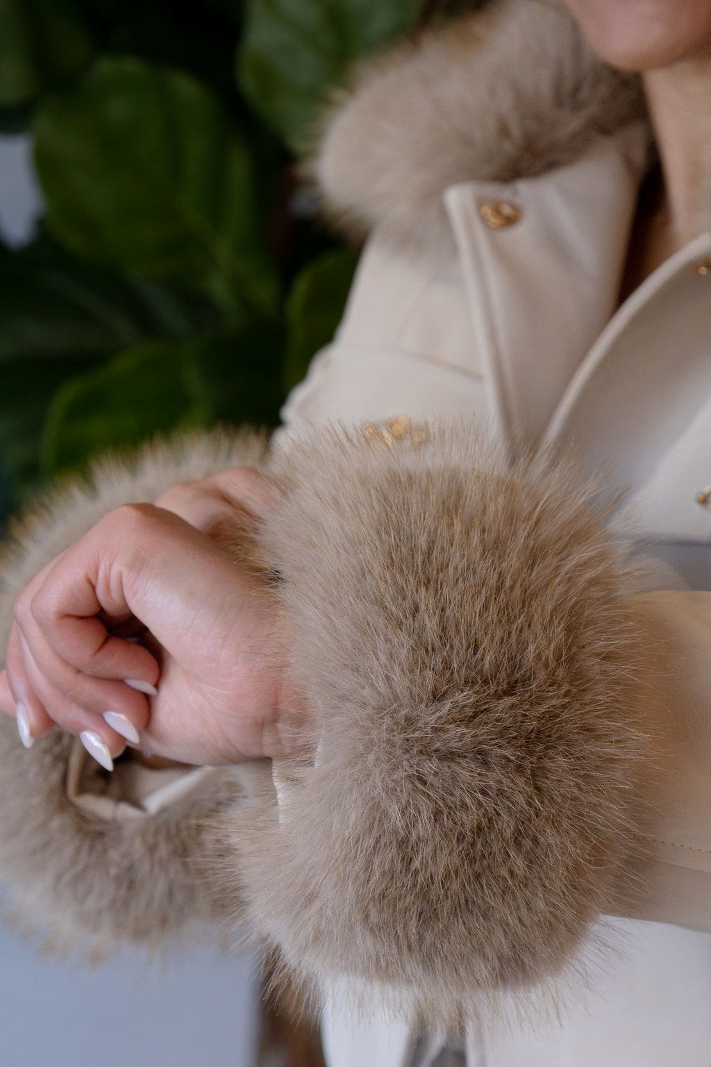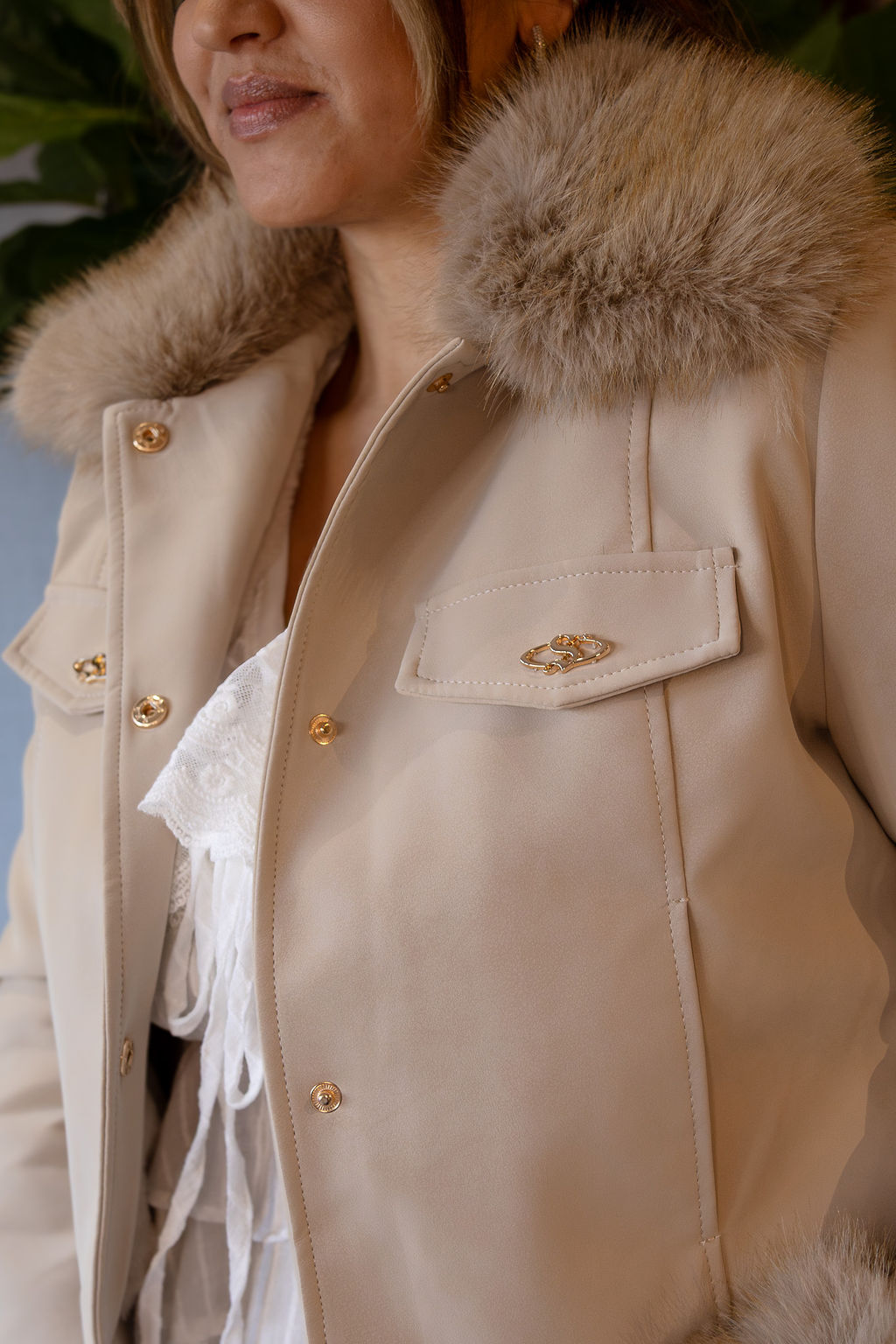 O modelo conta com pêlo sintético macio e envolvente no colarinho e nos punhos, acrescentando um toque luxuoso e feminino à peça. O corte curto e estruturado valoriza a silhueta, enquanto os botões dourados e os bolsos frontais com pala reforçam o carácter elegante e cuidado do design.