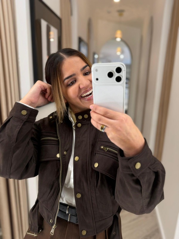 O design biker destaca-se pelos bolsos com fecho em zíper e botões metálicos dourados, que reforçam o caráter urbano da peça. O cinto ajustável na base acrescenta versatilidade e permite adaptar o casaco à silhueta, garantindo um visual moderno e personalizado.