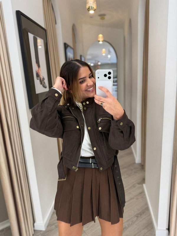 CASACO BIKER CASTANHO EM CAMURÇA SINTÉTICA PONTO CHIC
