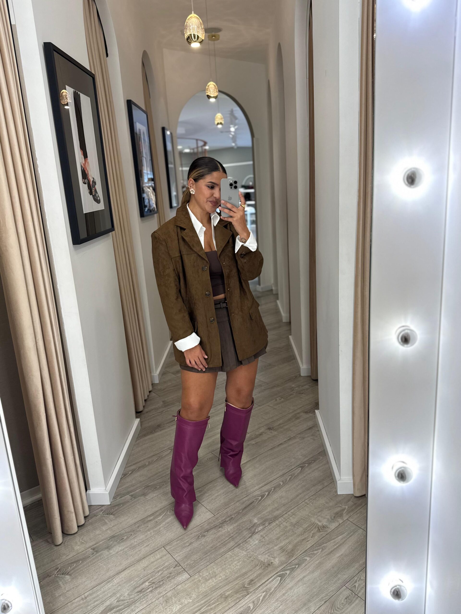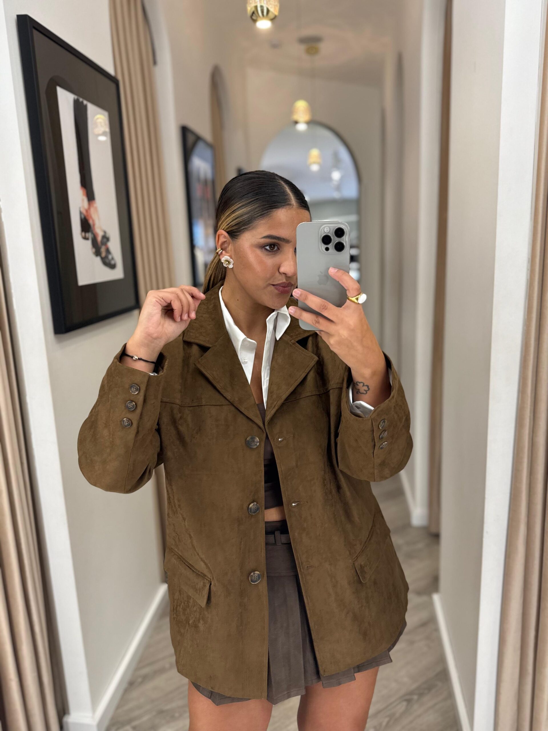 Com corte de blazer clássico, gola estruturada e fecho por botões frontais, esta peça destaca-se pelo toque luxuoso do tecido de efeito camurça, que confere profundidade e sofisticação ao visual. Os bolsos embutidos acrescentam funcionalidade sem perder a delicadeza do design.