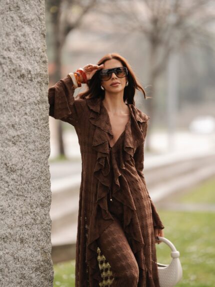 CASACO COMPRIDO RENDADO COM FOLHOS CASTANHO SAHOCO
