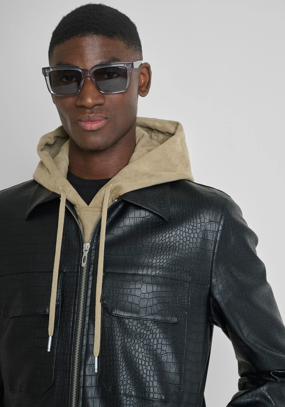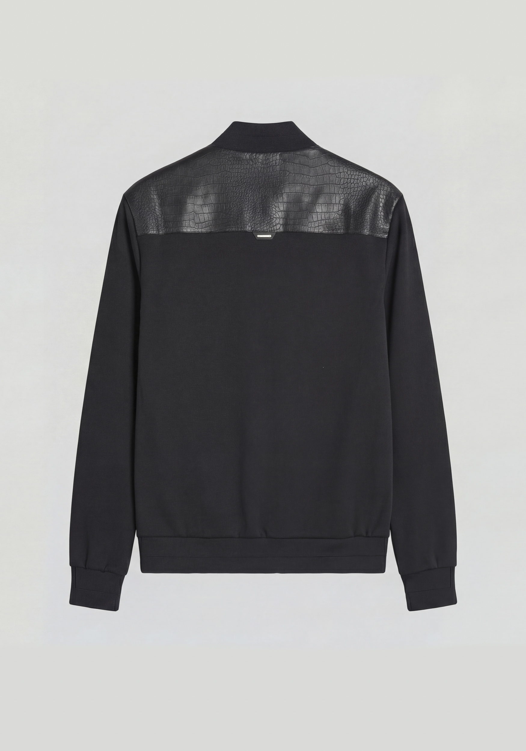 O modelo apresenta um fecho metálico integral, bolsos frontais embutidos com acabamentos limpos e punhos, gola e bainha em rib elástico para um caimento estruturado. Os detalhes cuidadosamente trabalhados — desde o padrão croco até às costuras precisas — reforçam o caracter contemporâneo e premium da peça.