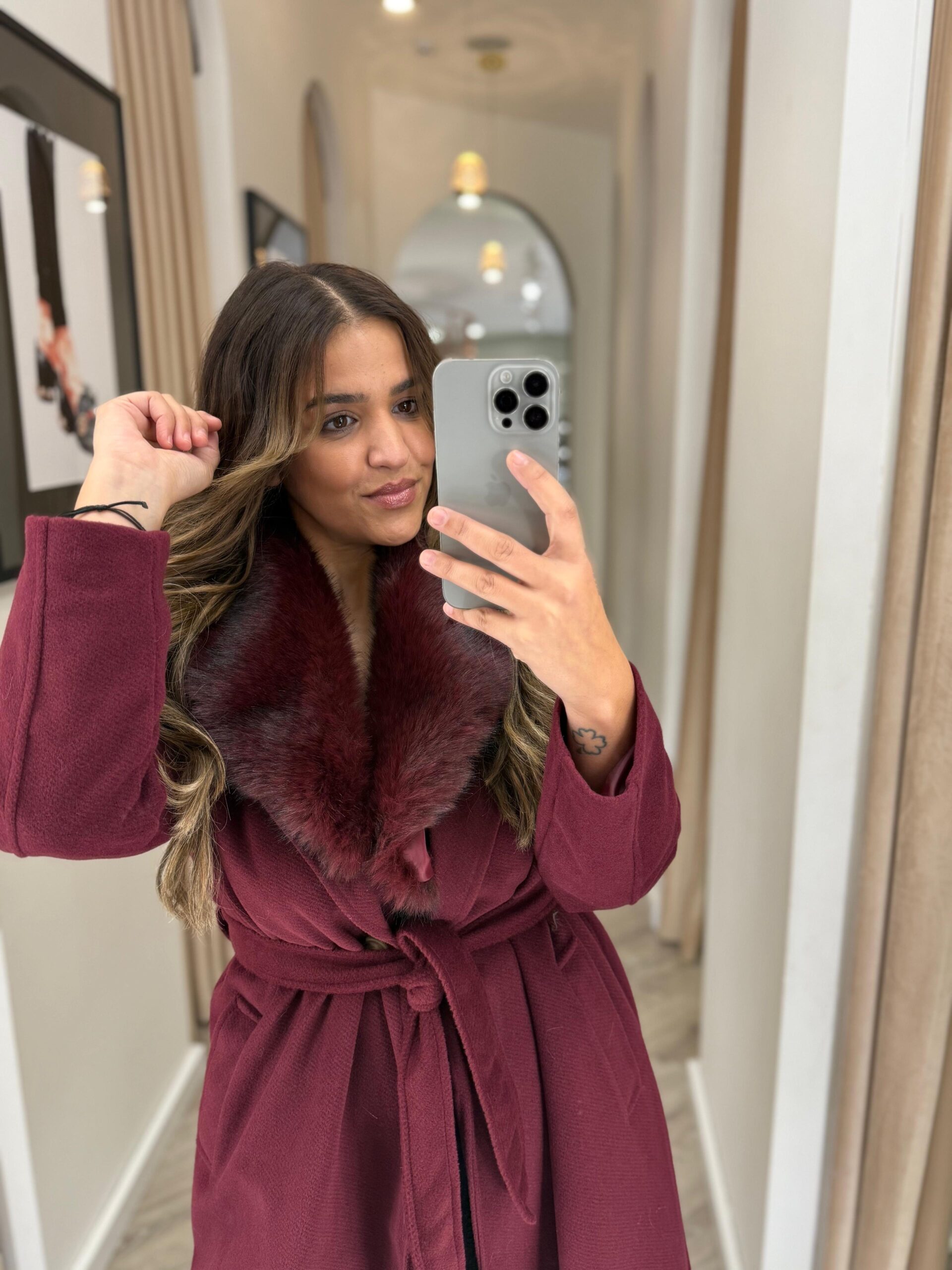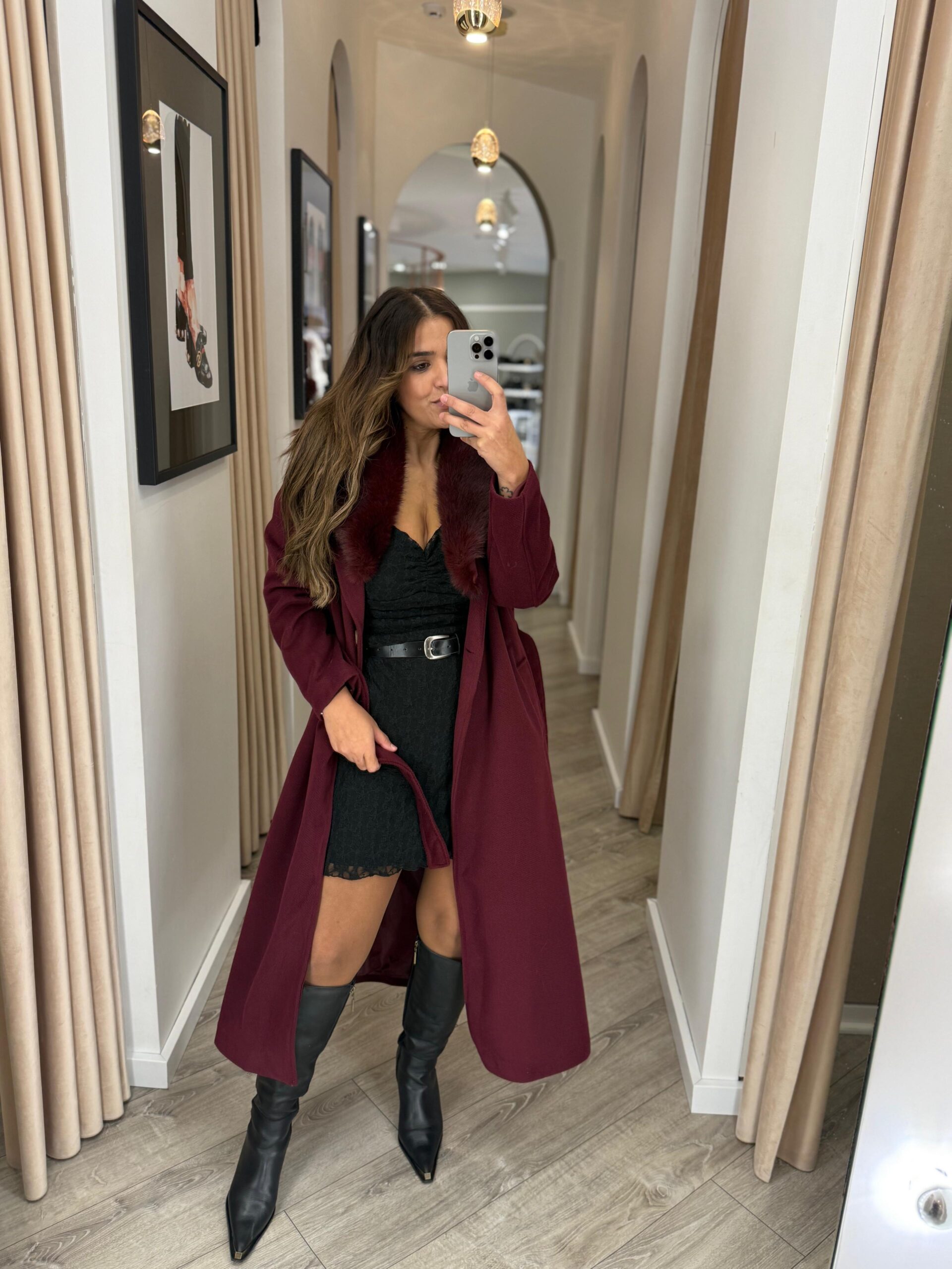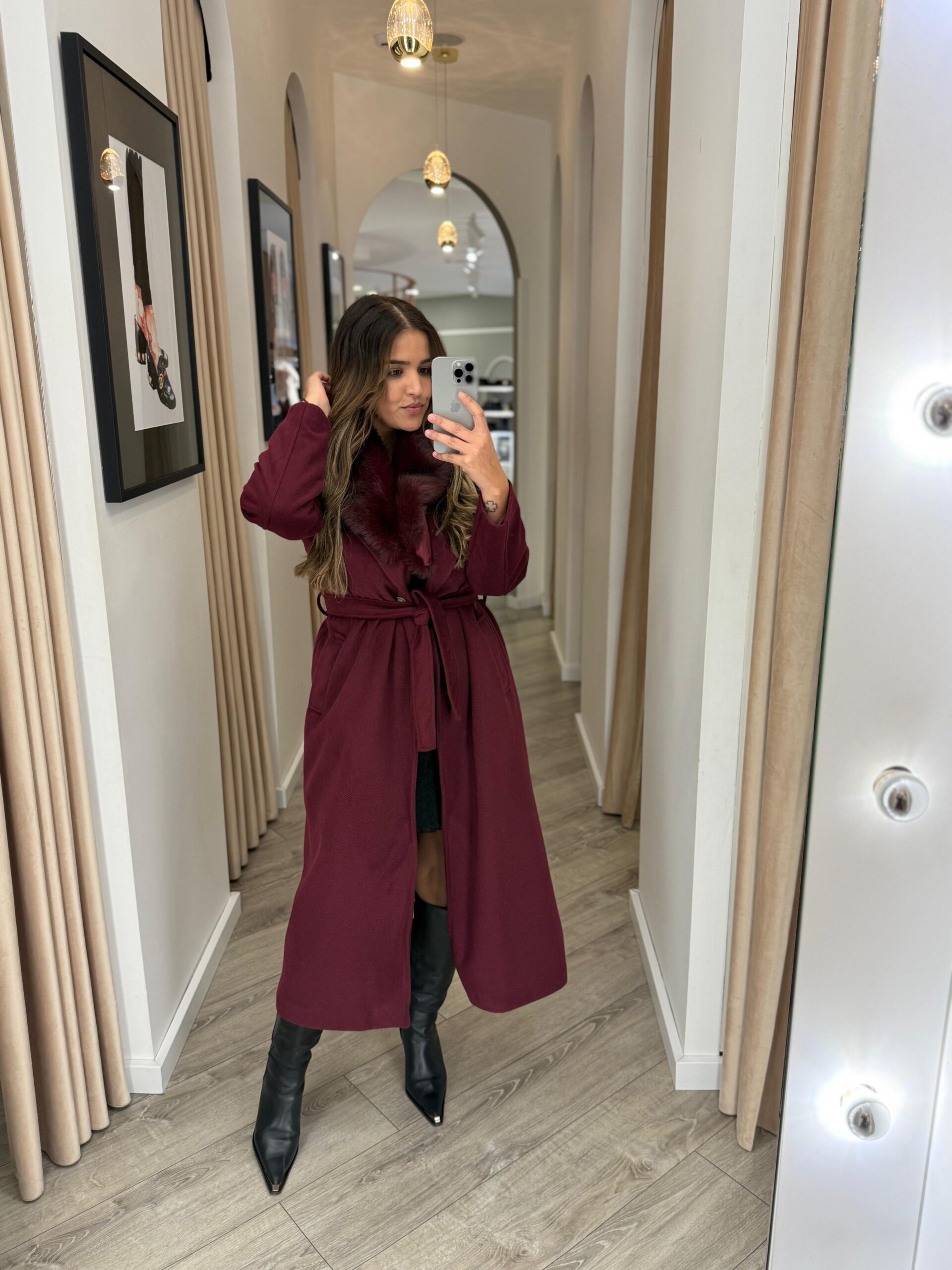 A gola adornada com pelo sintético criam um contraste sofisticado com o tom intenso do tecido, enquanto o cinto no mesmo material define a silhueta com charme.
