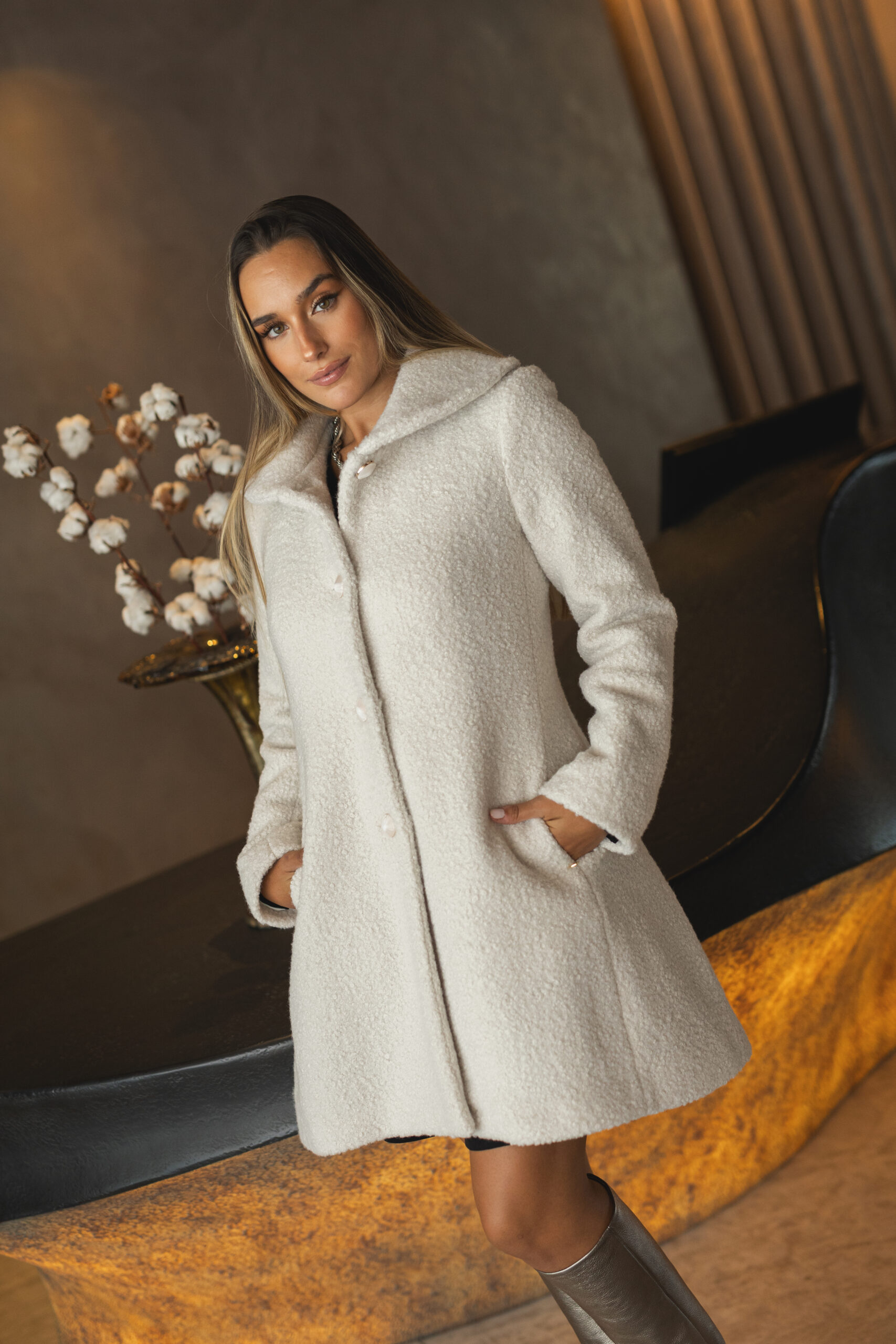 Versátil e requintado, este casaco pode ser usado com calças de alfaiataria, vestidos midi ou jeans elegantes, adaptando-se com naturalidade a qualquer ocasião. Uma peça essencial que alia calor, textura e estilo num só design.