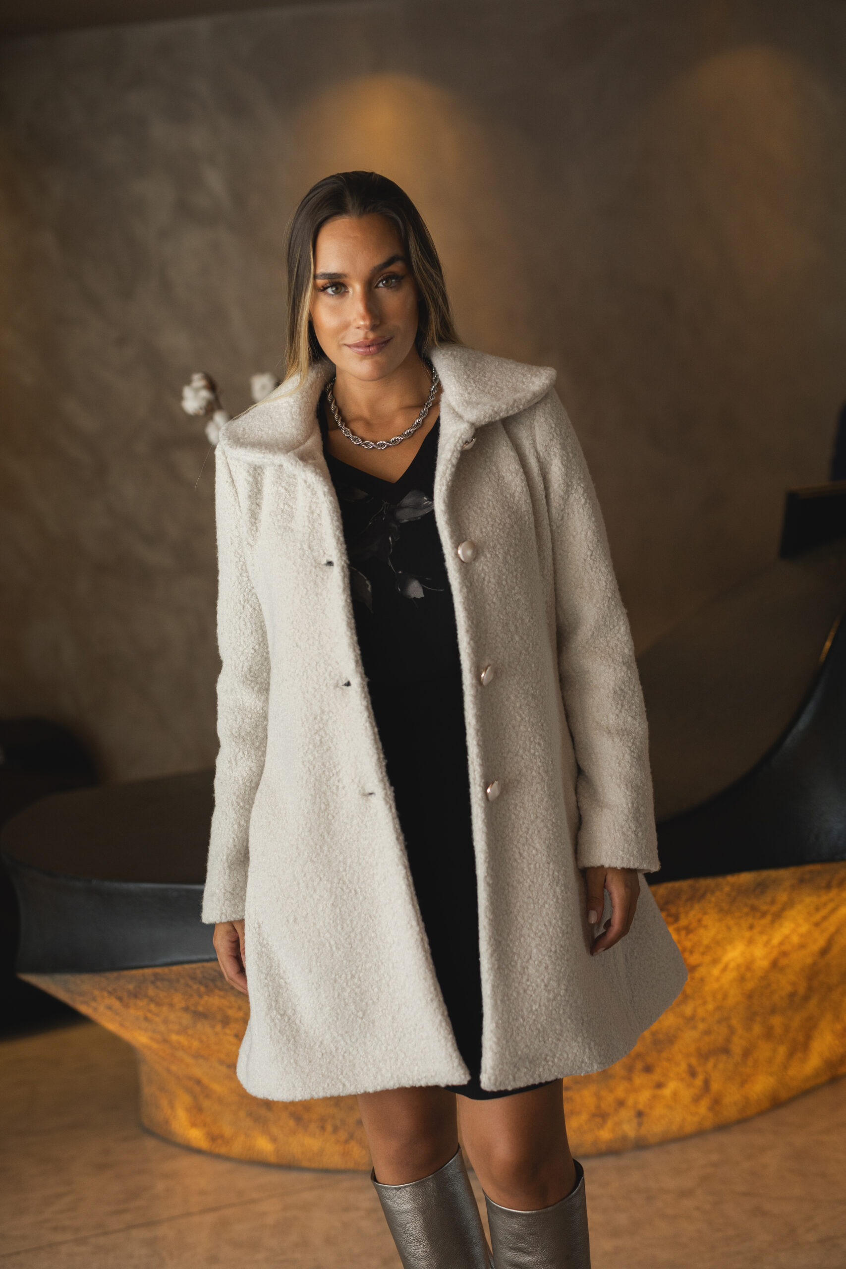O casaco branco da M.I.C.I.O. é a expressão máxima da elegância clássica com um toque contemporâneo. Confeccionado em 100% poliéster, destaca-se pelo tecido bouclé texturizado, que combina conforto, sofisticação e um aspeto visual rico, perfeito para a estação fria.