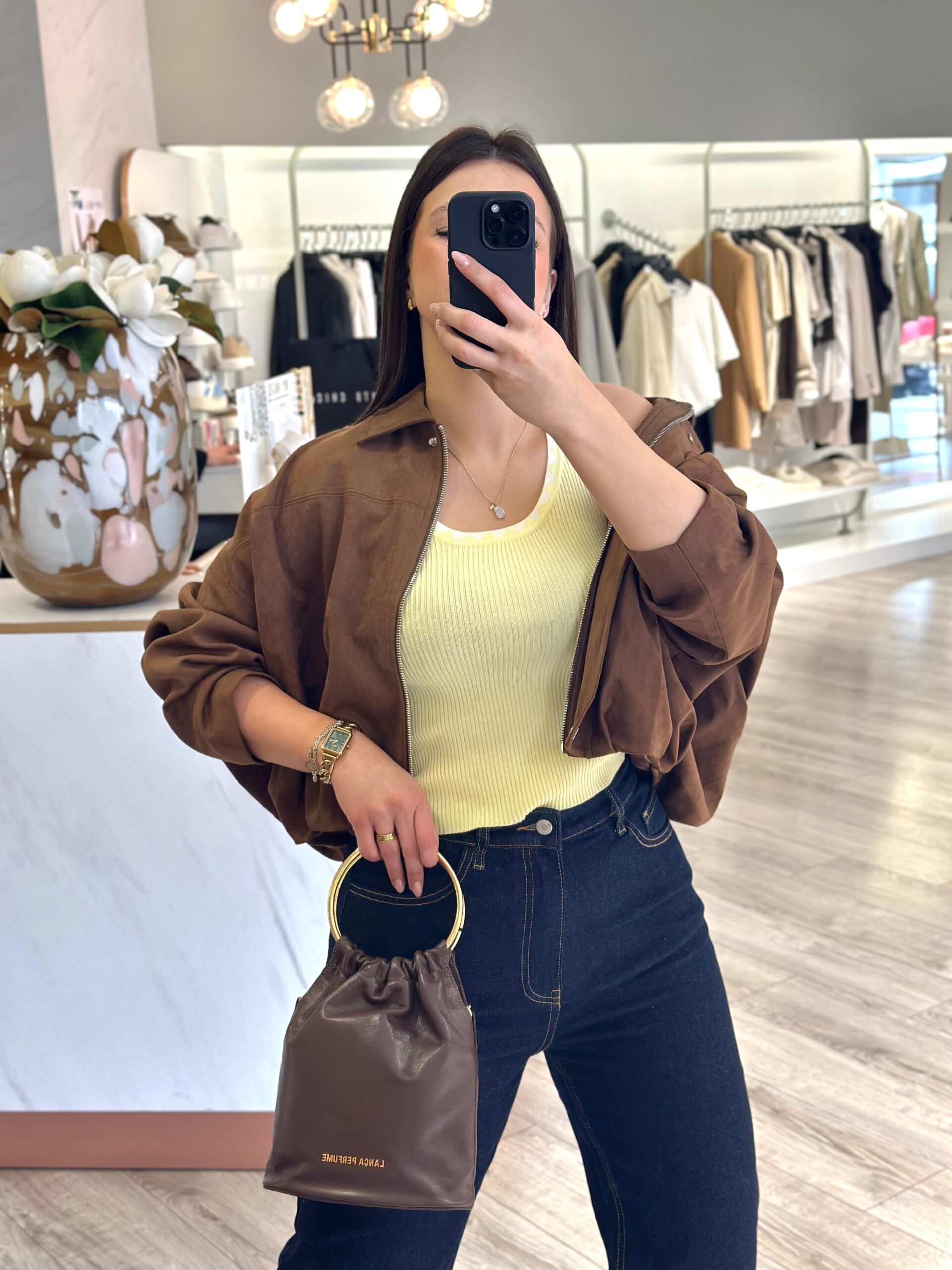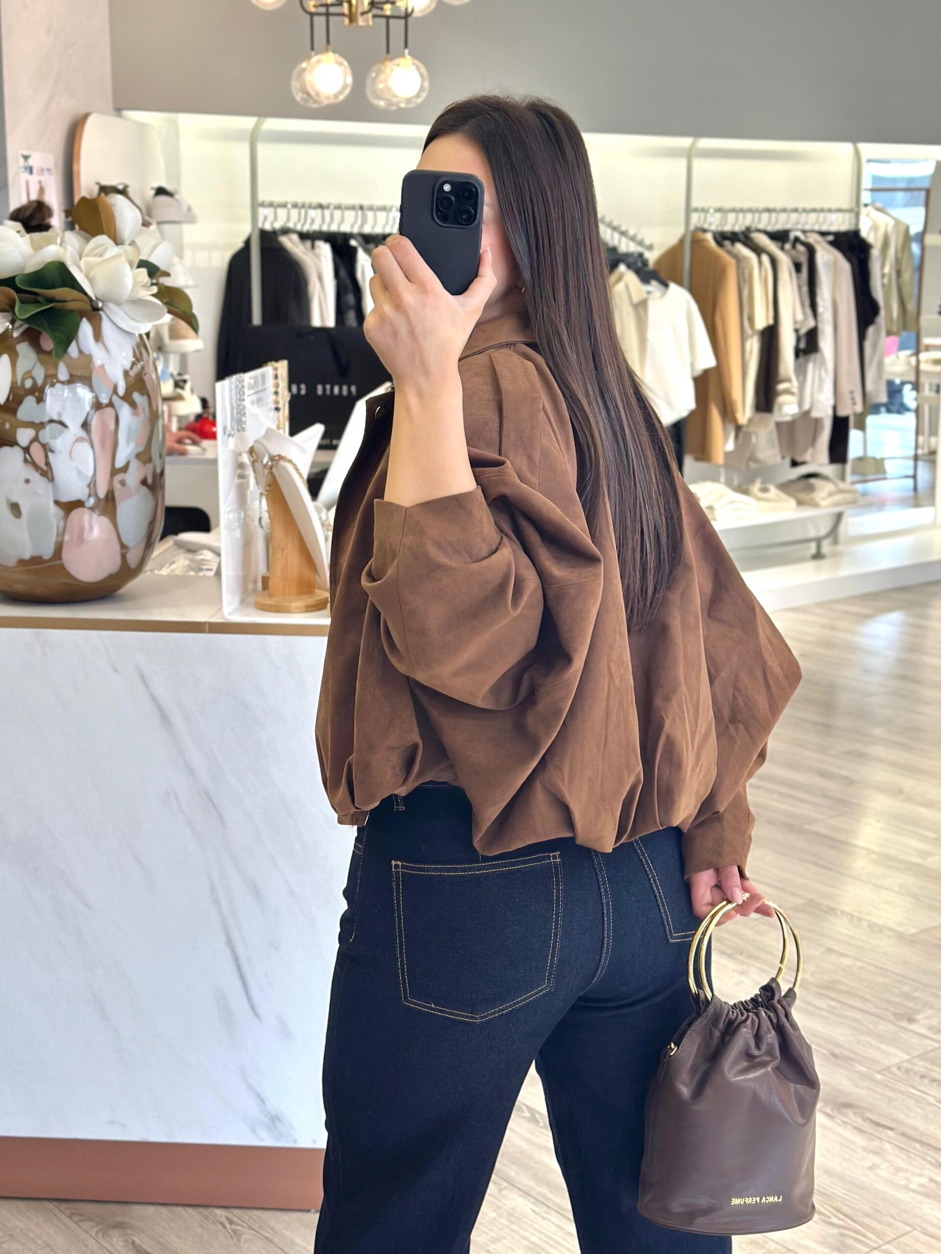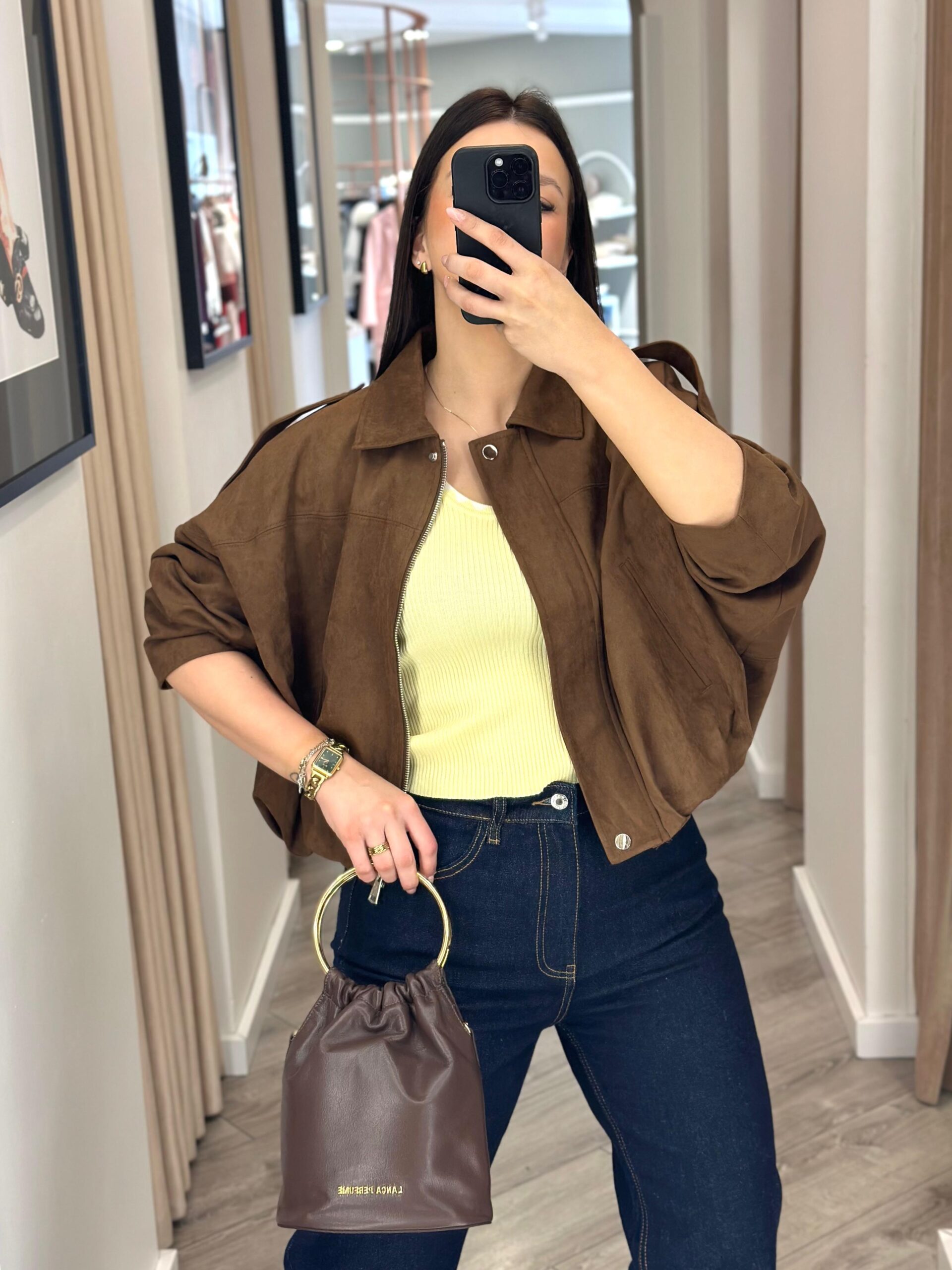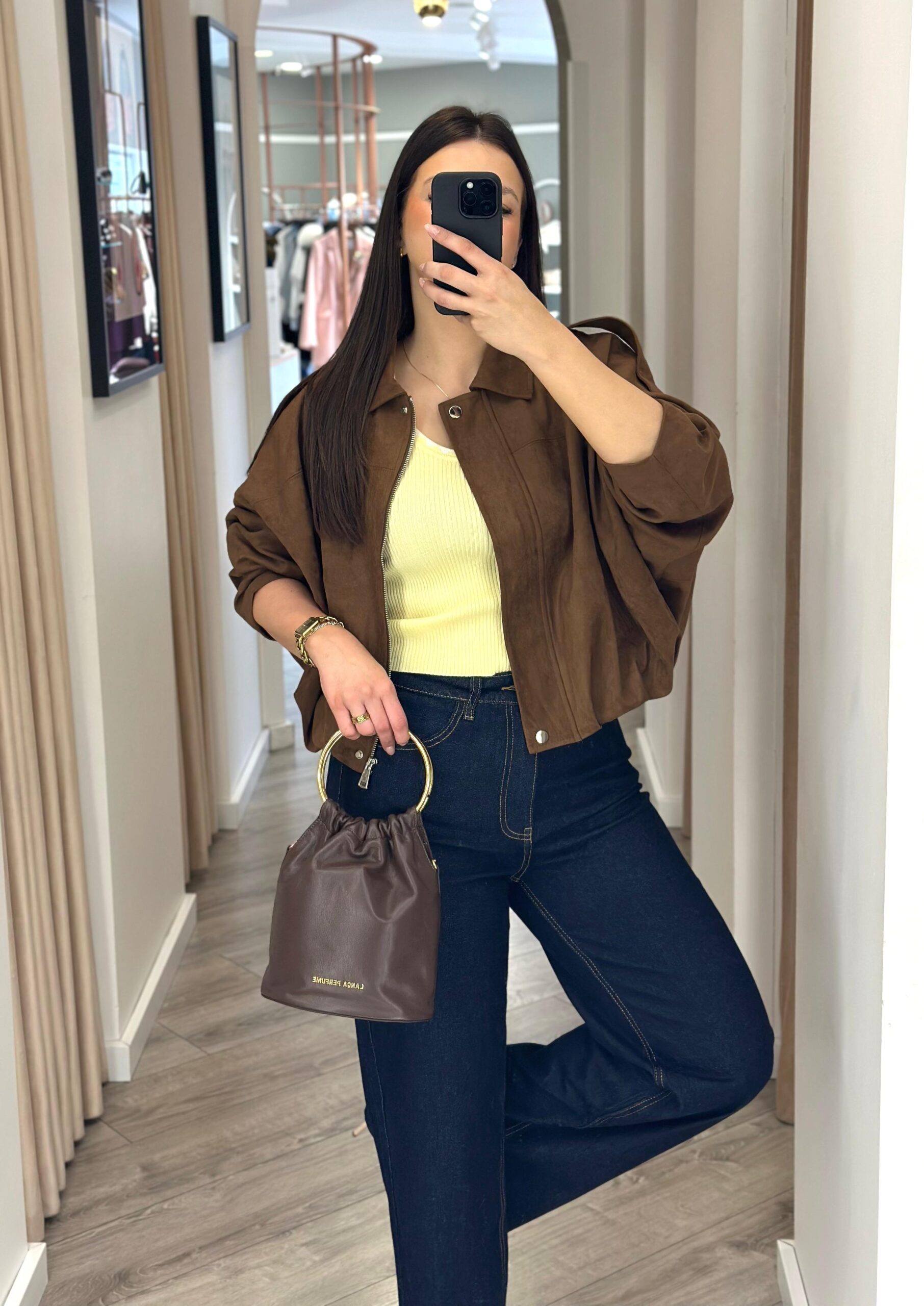 Com gola clássica, fecho frontal em zíper e botões discretos, este casaco combina praticidade com um design moderno. O acabamento em efeito camurça realça a elegância, enquanto o corte solto proporciona versatilidade para diferentes estilos.