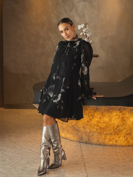 VESTIDO PRETO FLORAL COM MANGAS EM CHIFFON MISS YOU