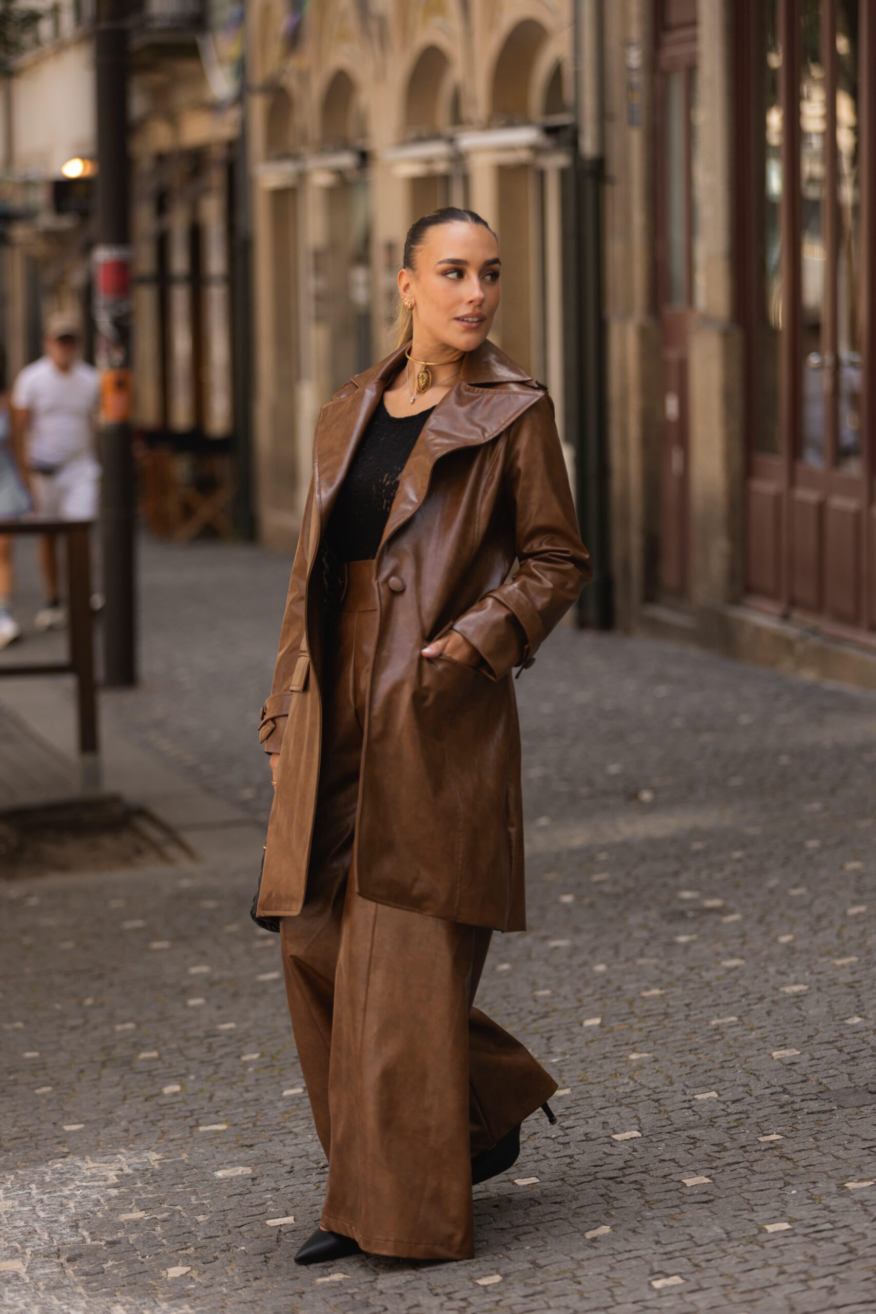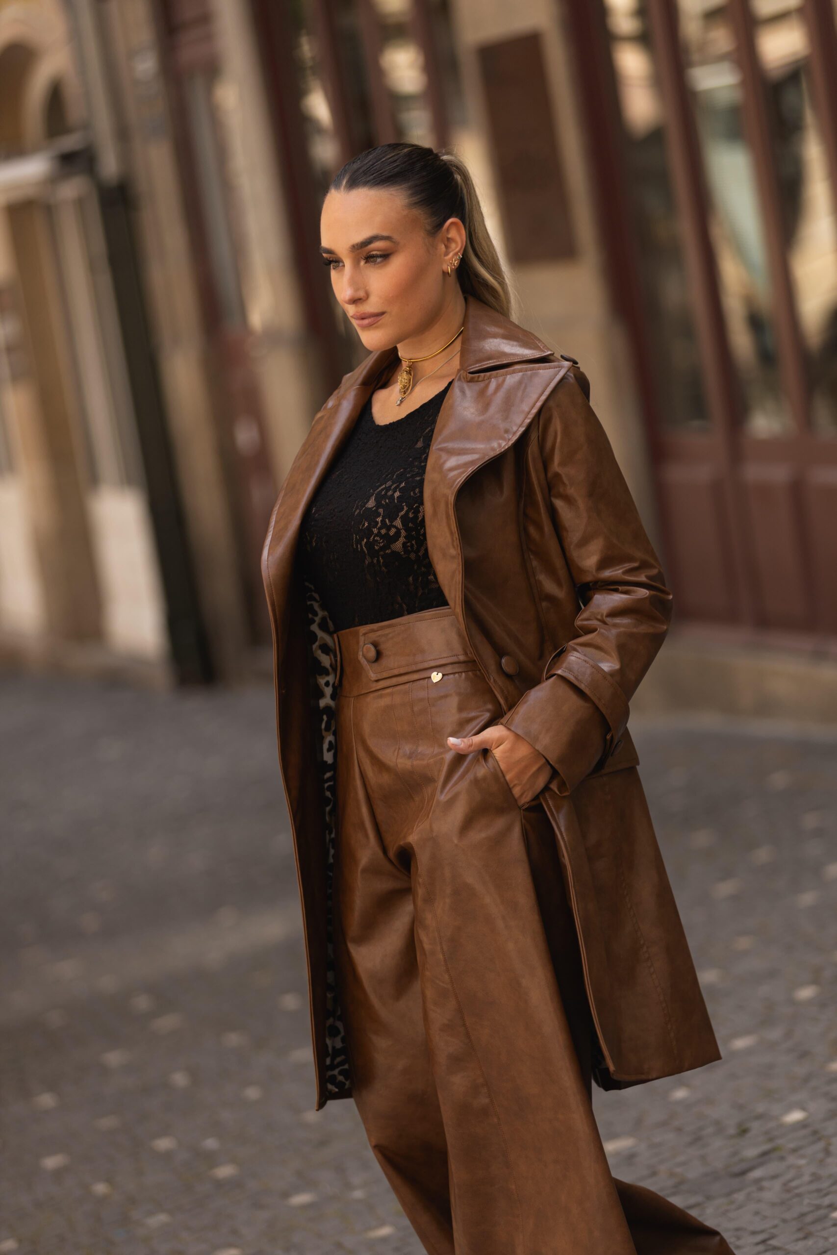 O casaco camel da Miss You é a definição de elegância urbana com atitude contemporânea. Produzido em 100% poliuretano, apresenta o aspeto luxuoso da pele verdadeira com toque suave e estrutura firme, garantindo conforto e durabilidade. O interior revela um forro em 100% viscose com padrão animal print, um detalhe inesperado que traduz o ADN ousado e sofisticado da marca.