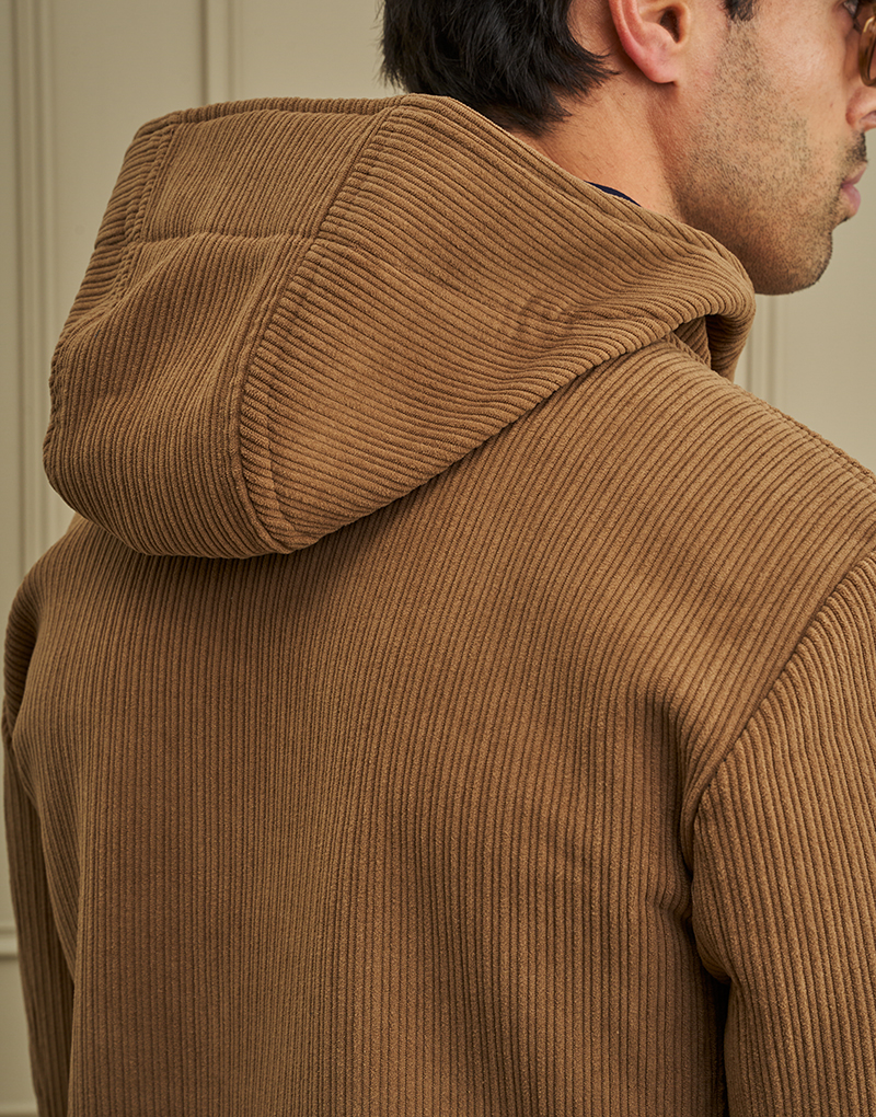 Apresenta o icónico fecho em cordão com peças de madeira, capuz integrado e bolsos frontais, detalhes que reforçam o seu caráter funcional e moderno.