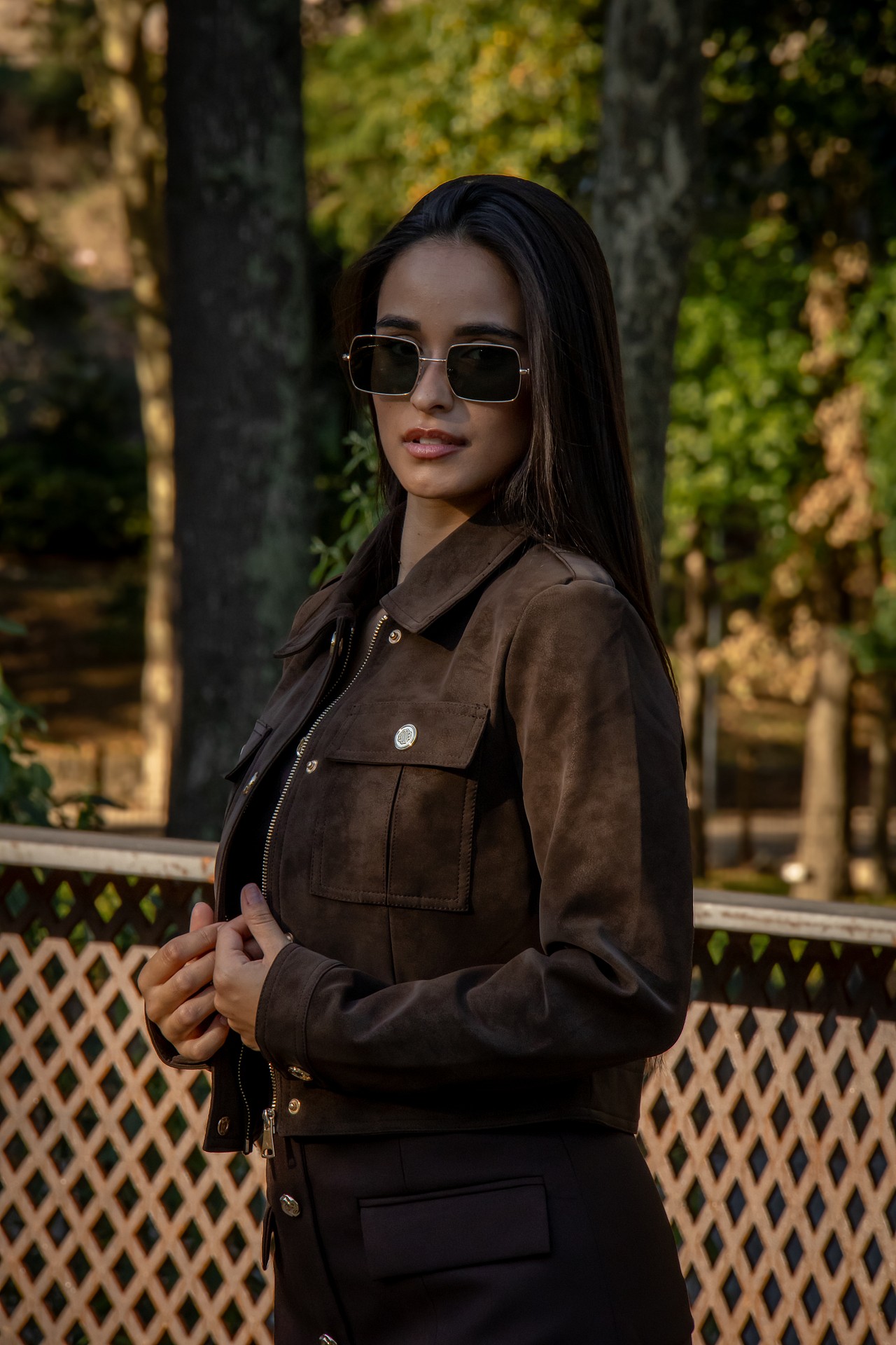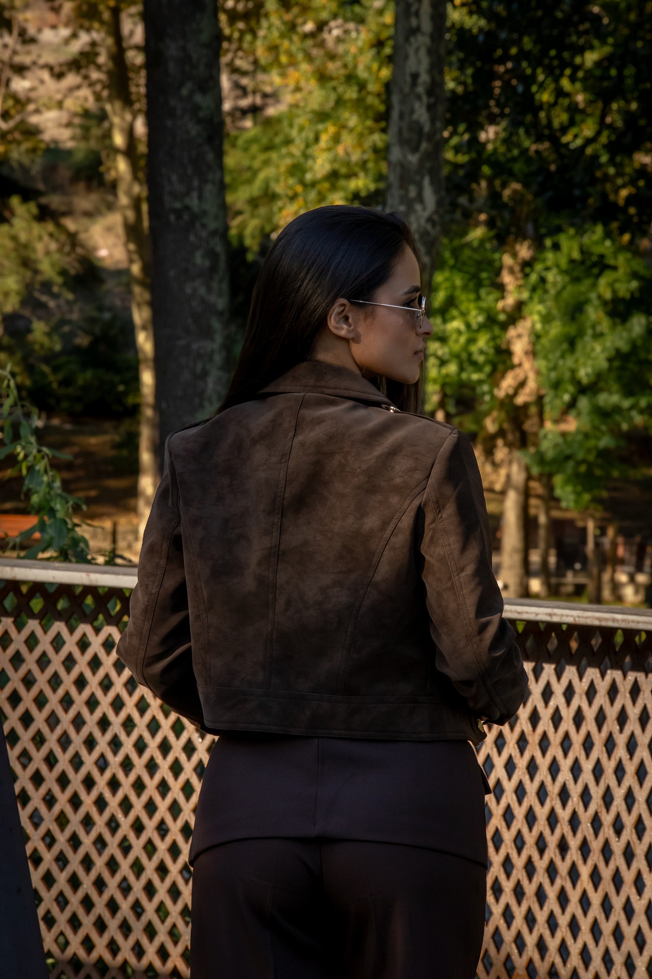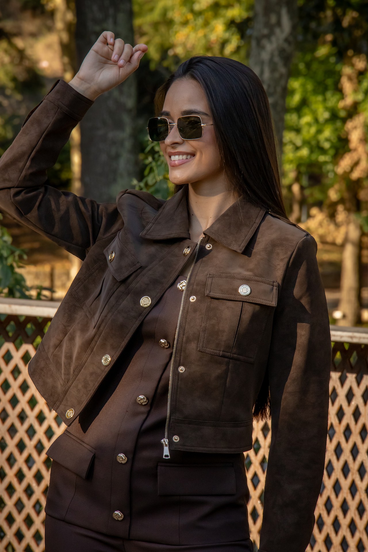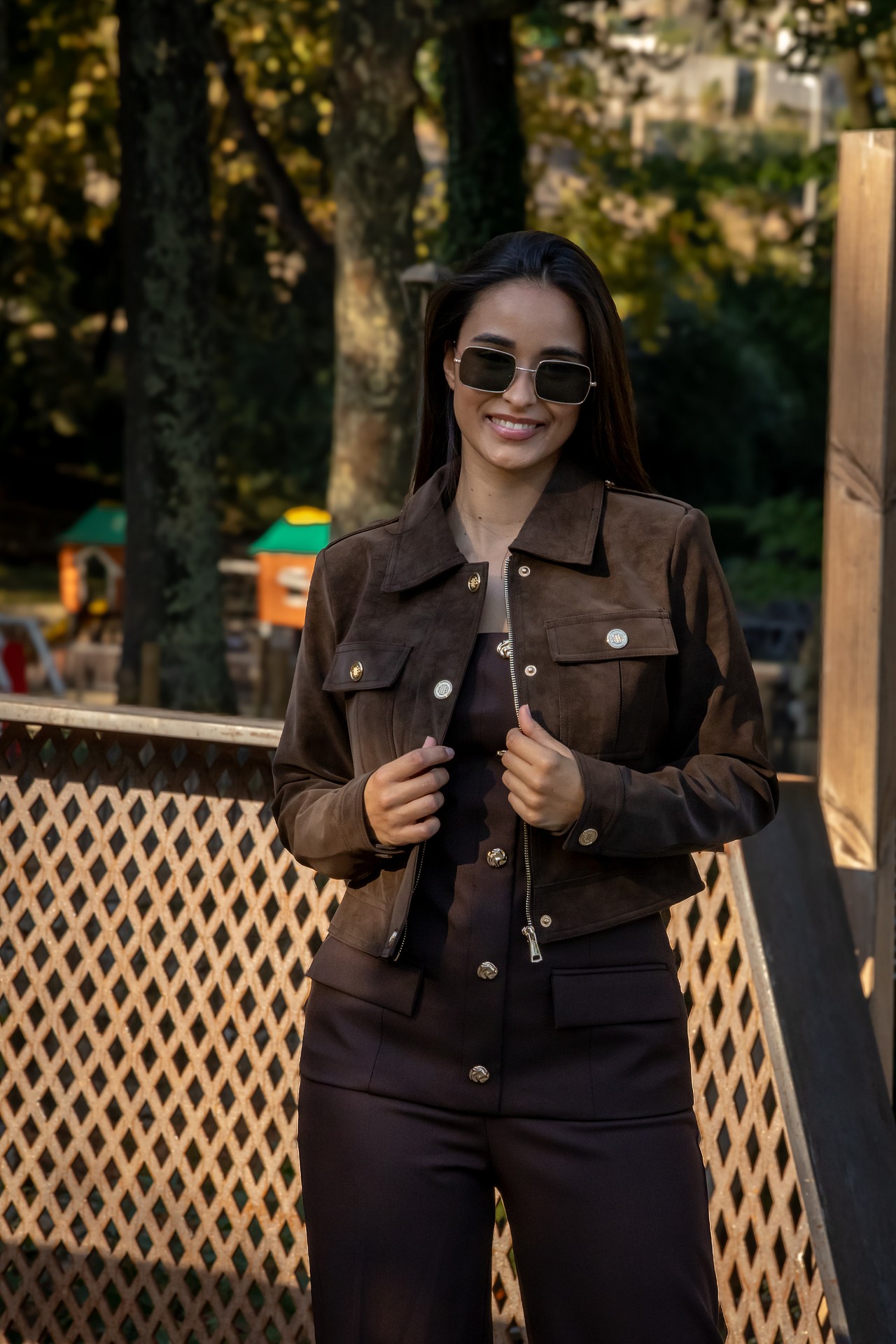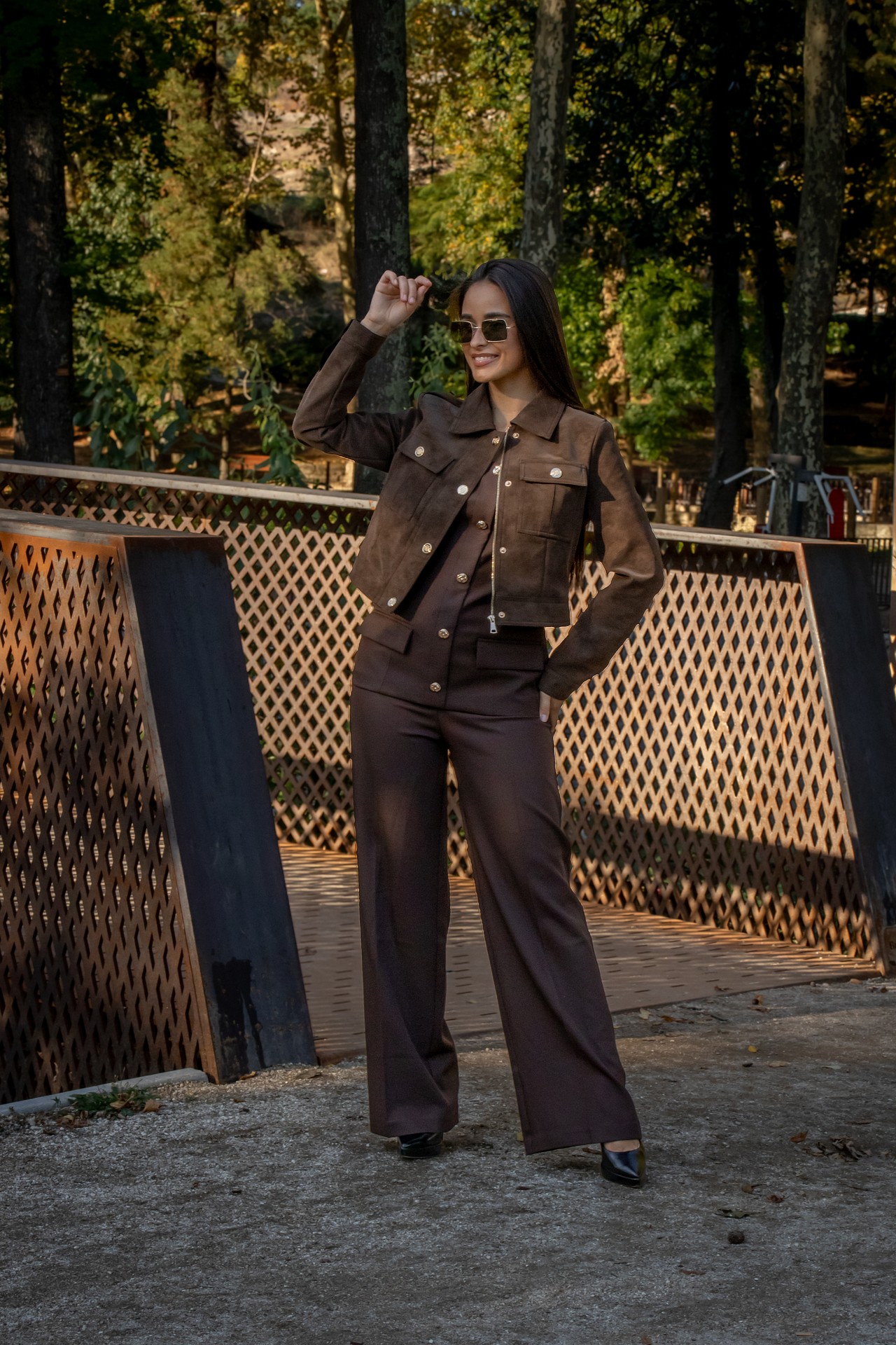 O casaco castanho da Ponto Chic combina modernidade e sofisticação, destacando-se pelo acabamento elegante e pelos detalhes de inspiração clássica. Confeccionado em 52% poliuretano e 48% poliéster, com forro em 100% poliéster, garante resistência, conforto e um toque macio que remete ao efeito camurça.
