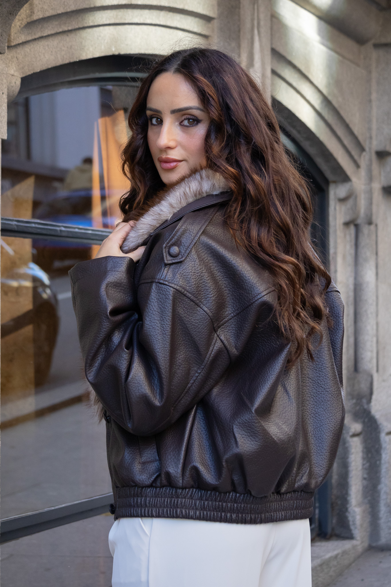 Este casaco em efeito pele castanho da Ponto Chic combina atitude urbana com um toque sofisticado e acolhedor. Confeccionado em tecido de elevada qualidade, apresenta uma estrutura confortável e resistente, ideal para os dias mais frios, com forro interior que garante maior conforto térmico.