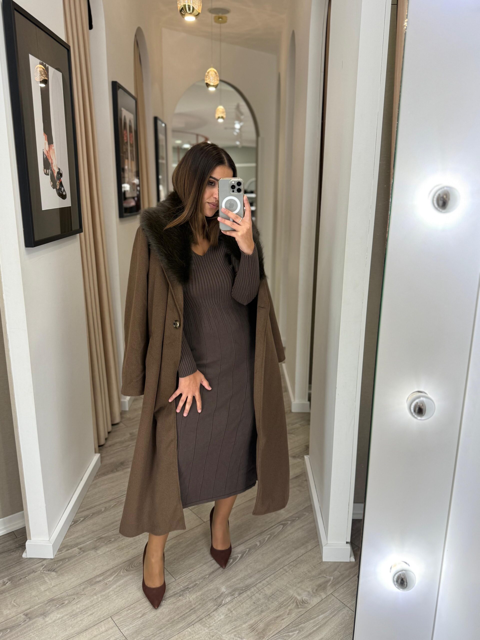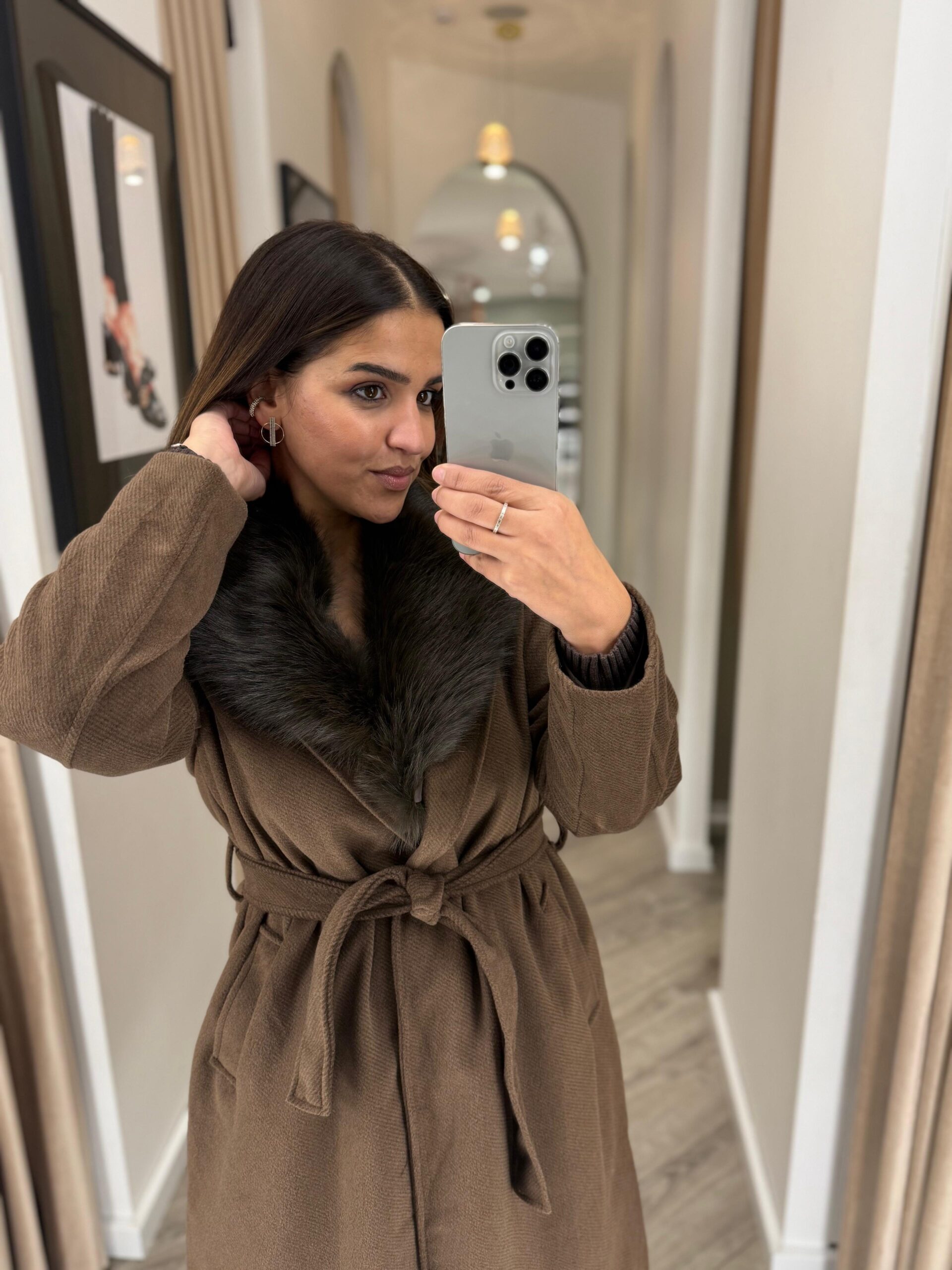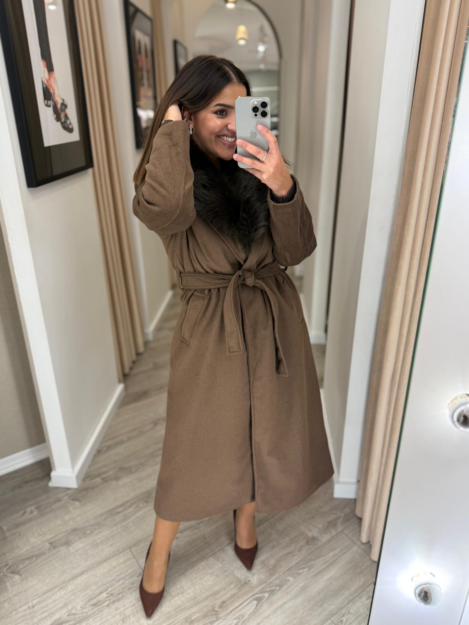A gola em pelo sintético elevam o design com um toque luxuoso, realçando a profundidade e o calor do tom castanho. O cinto do mesmo tecido permite ajustar a silhueta com elegância, acrescentando equilíbrio e feminilidade à peça.
