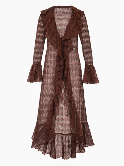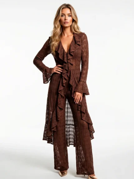 O casaco castanho em ecopele Ponto Chic combina atitude e elegância num só design. Produzido em 57% poliuretano e 43% poliéster, com forro interior em 100% poliéster, apresenta um acabamento texturizado que confere um toque moderno e sofisticado.