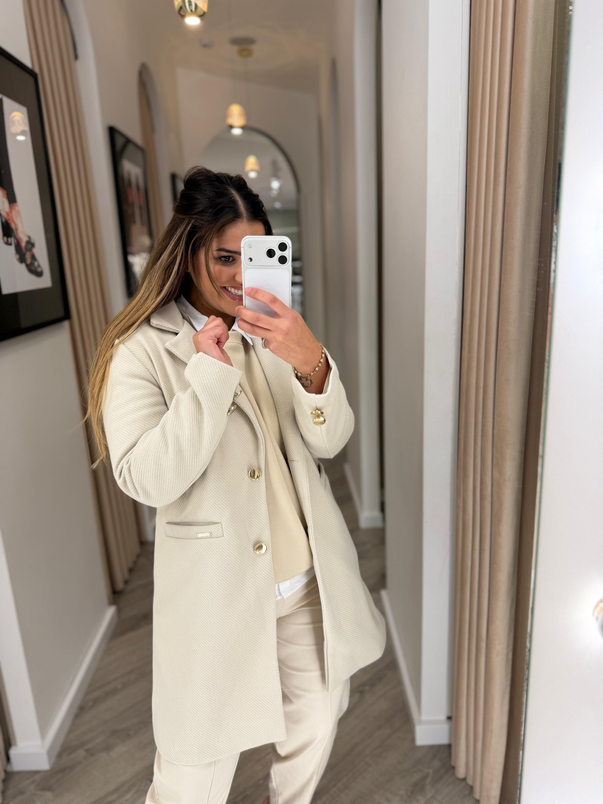 No tom bege claro, luminoso e elegante, o design apresenta lapela clássica, fecho frontal com botões dourados e bolsos laterais discretos, detalhes que reforçam o carácter refinado da peça. O comprimento midi torna-o versátil e fácil de conjugar, ideal tanto para looks formais como para produções mais urbanas.