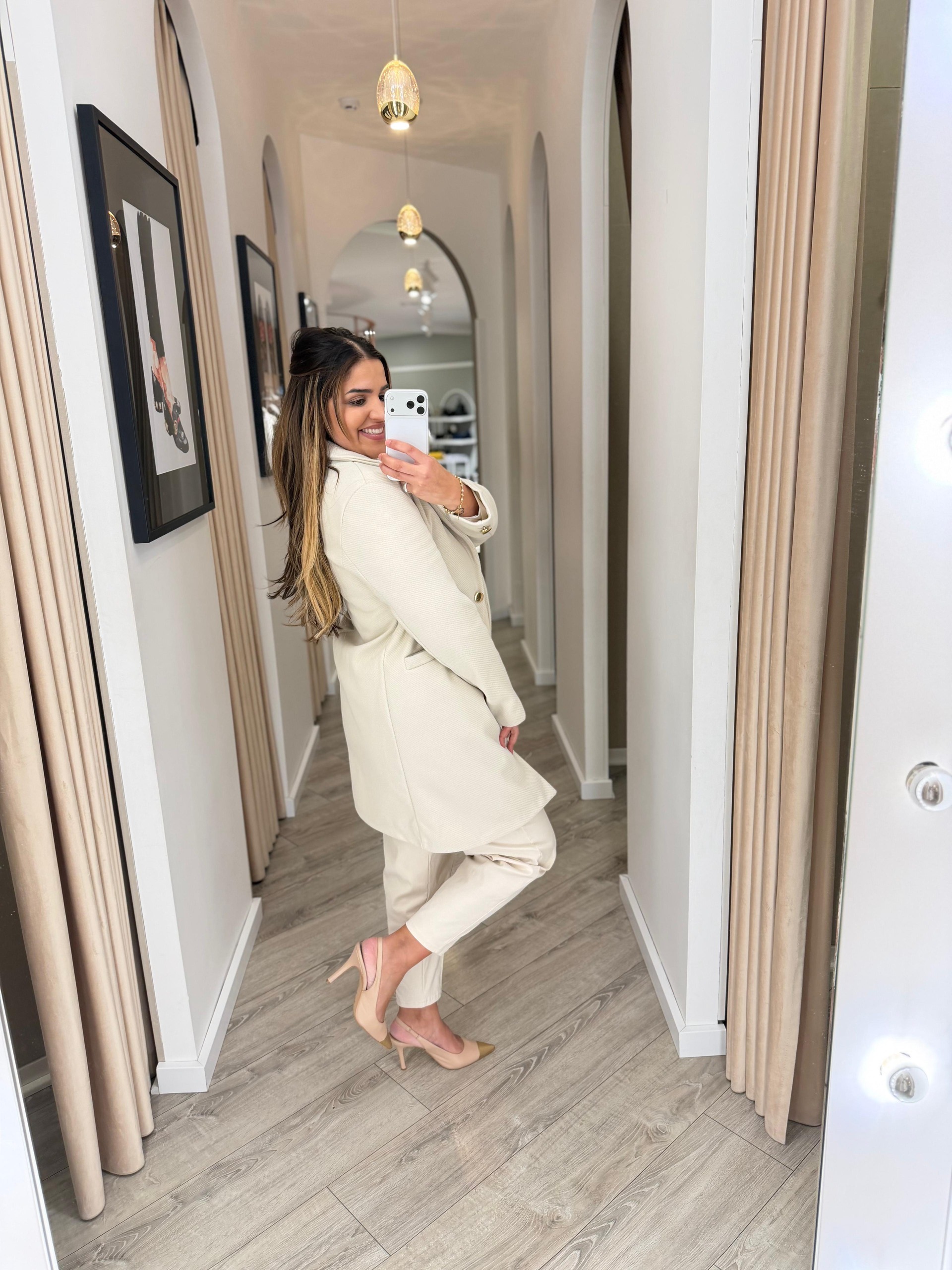 Uma peça essencial de guarda-roupa, este casaco bege claro Ponto Chic adapta-se a diferentes estilos e ocasiões, funcionando perfeitamente sobre vestidos, malhas ou coordenados de alfaiataria.