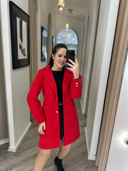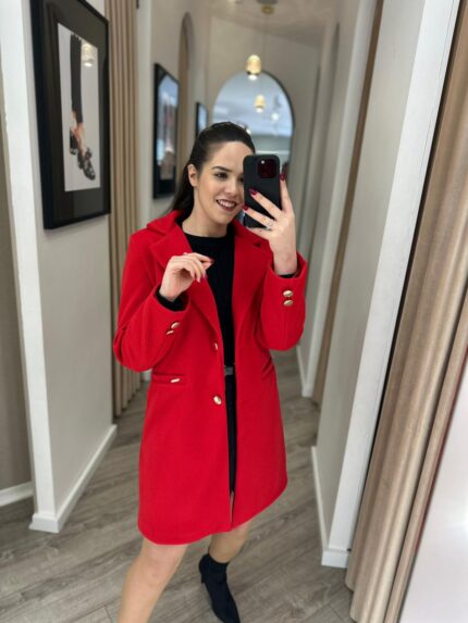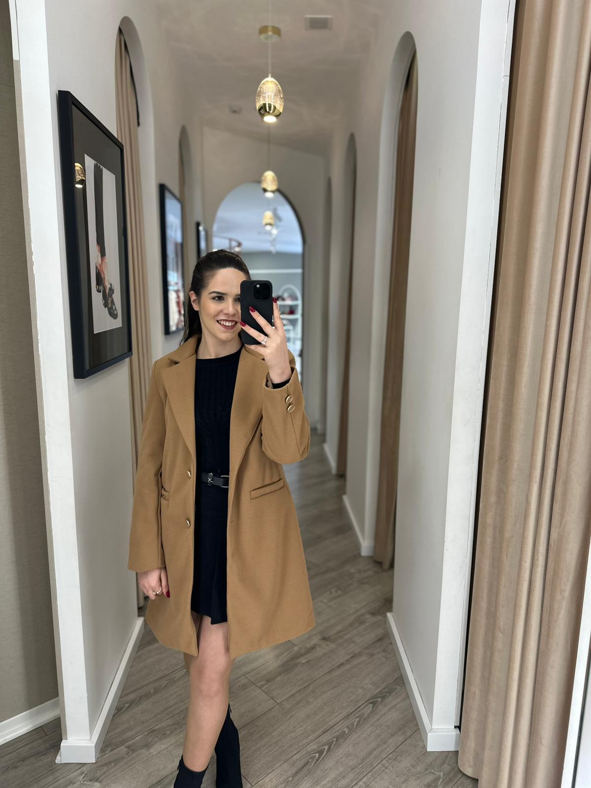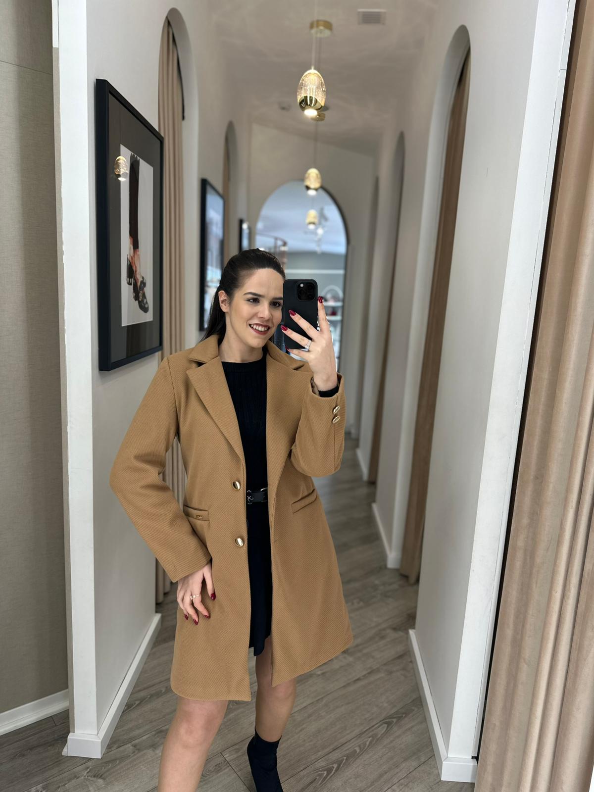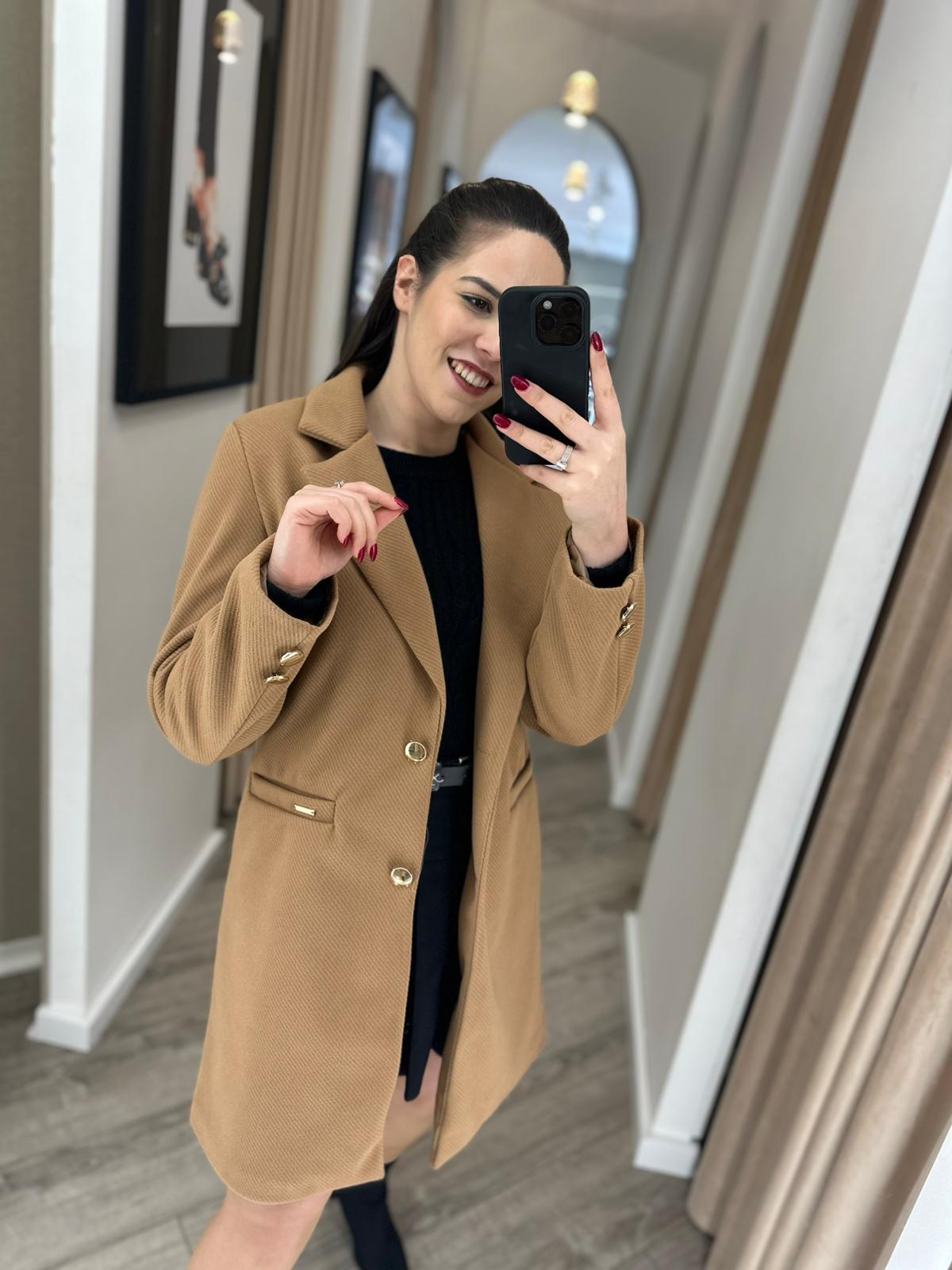 No tom camel, quente e sofisticado, o design apresenta lapela clássica, fecho frontal com botões dourados e bolsos laterais discretos, detalhes que conferem um ar elegante e atual. O comprimento midi torna-o versátil e fácil de conjugar.
