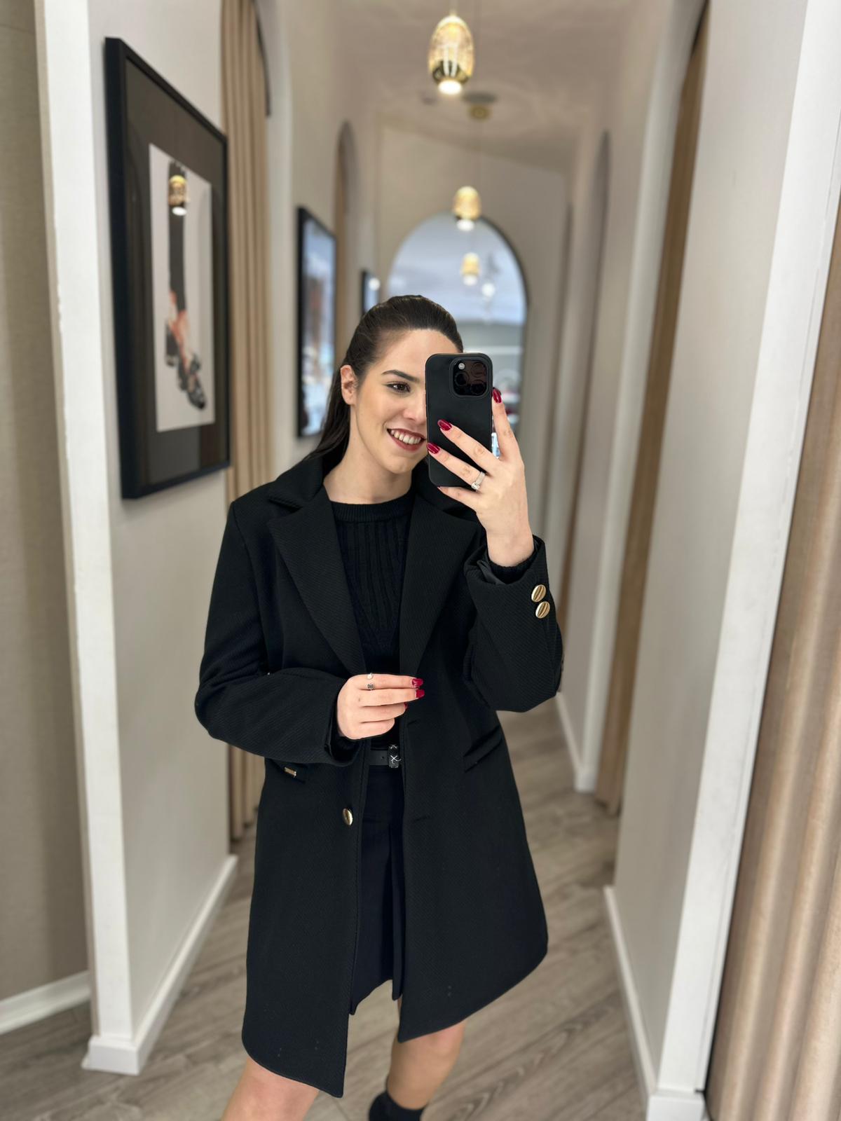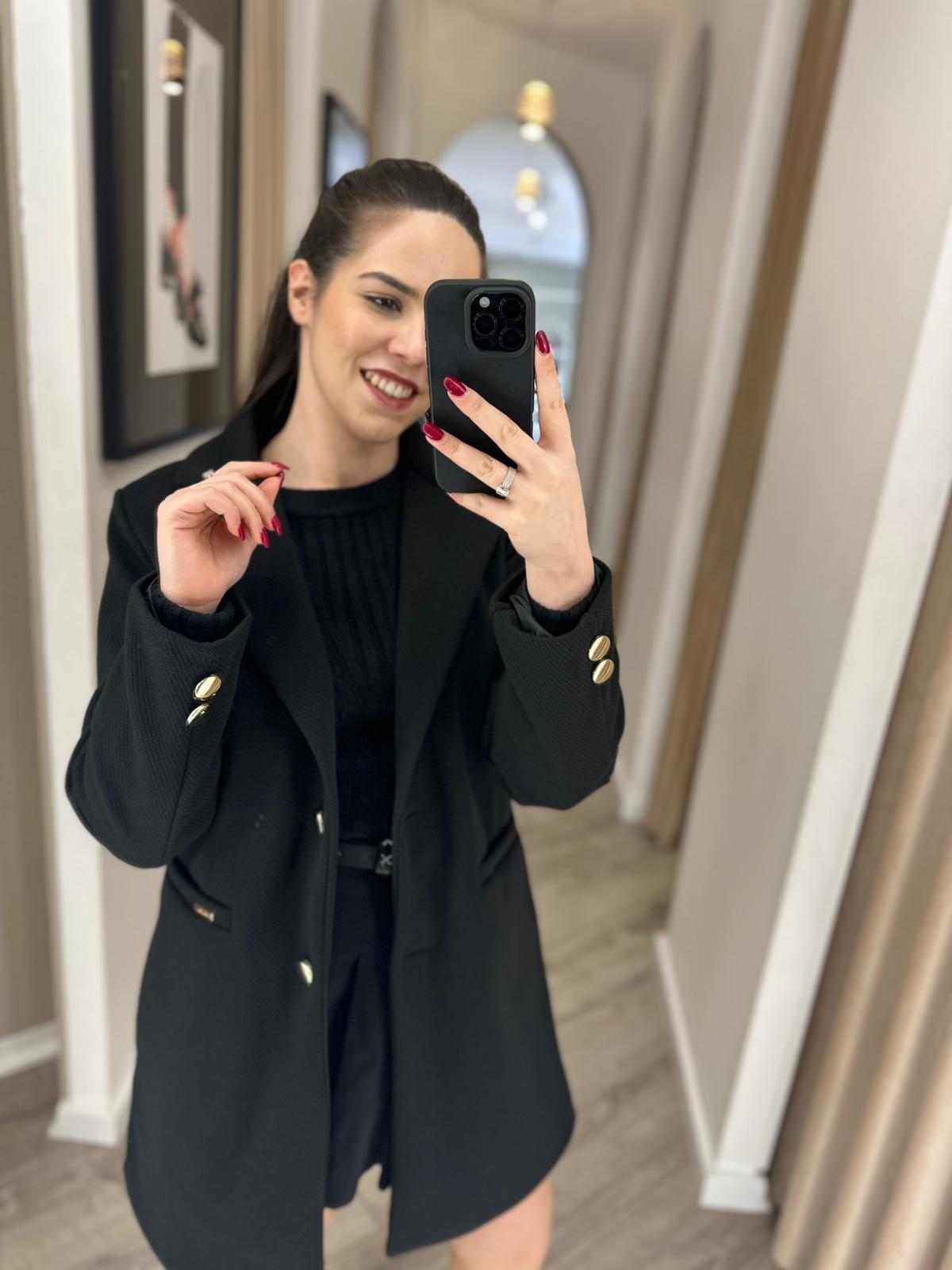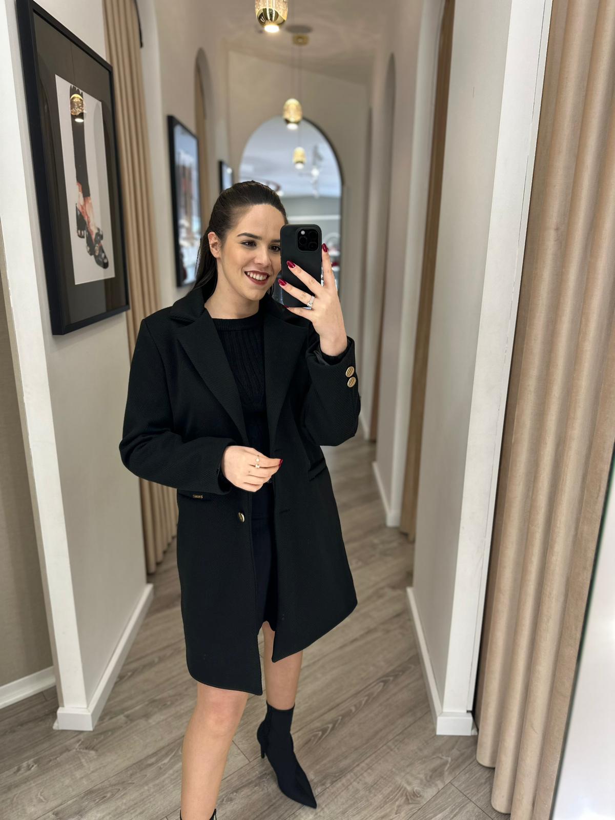 No tom preto, clássico e intemporal, o design apresenta lapela clássica, fecho frontal com botões dourados e bolsos laterais discretos, detalhes que reforçam o carácter refinado da peça. O comprimento midi torna-o versátil e fácil de conjugar, ideal tanto para looks formais como para produções mais urbanas.