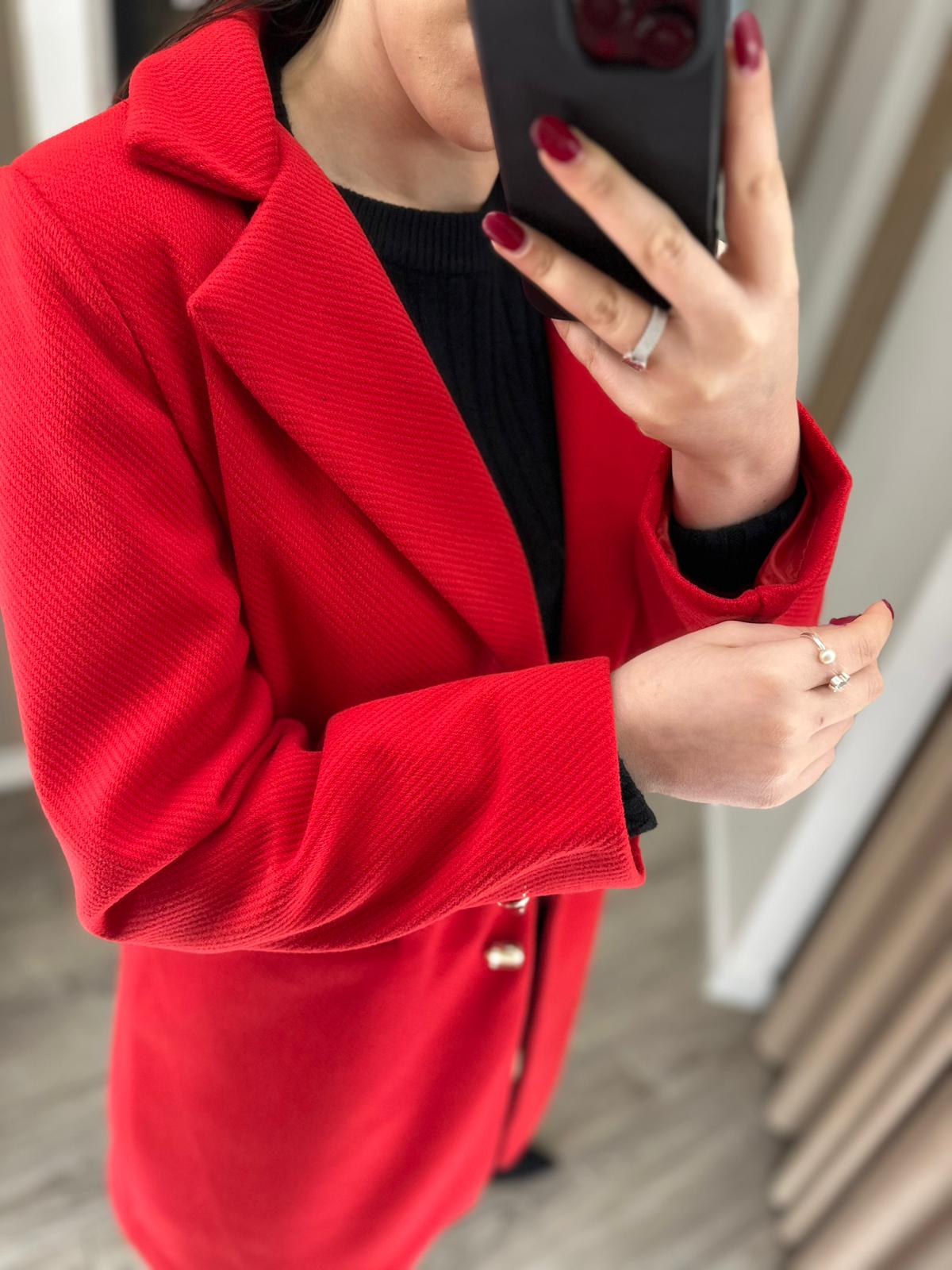 Uma peça essencial de guarda-roupa, este casaco vermelho Ponto Chic adapta-se a diferentes estilos e ocasiões, funcionando perfeitamente sobre vestidos, malhas ou coordenados de alfaiataria.