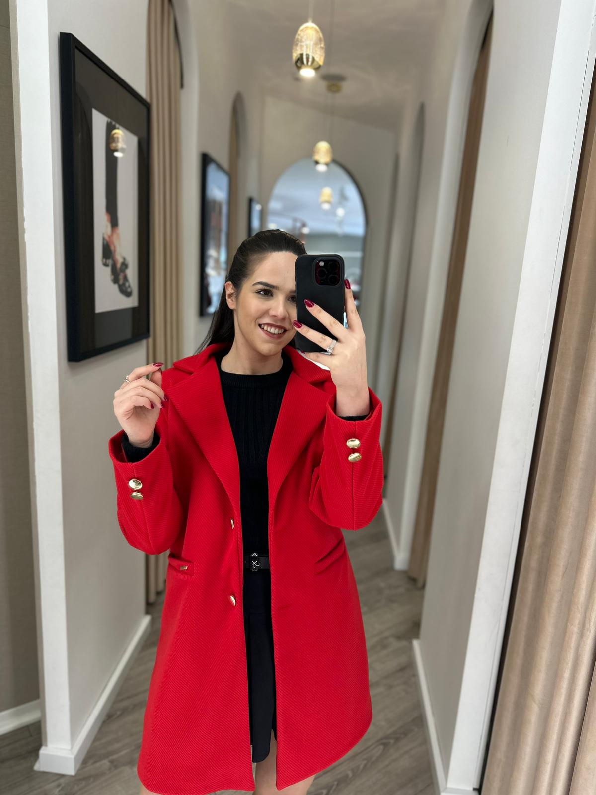No tom vermelho, marcante e elegante, o design apresenta lapela clássica, fecho frontal com botões dourados e bolsos laterais discretos, detalhes que elevam o visual. O comprimento midi garante versatilidade, ideal para looks formais ou produções urbanas de impacto.