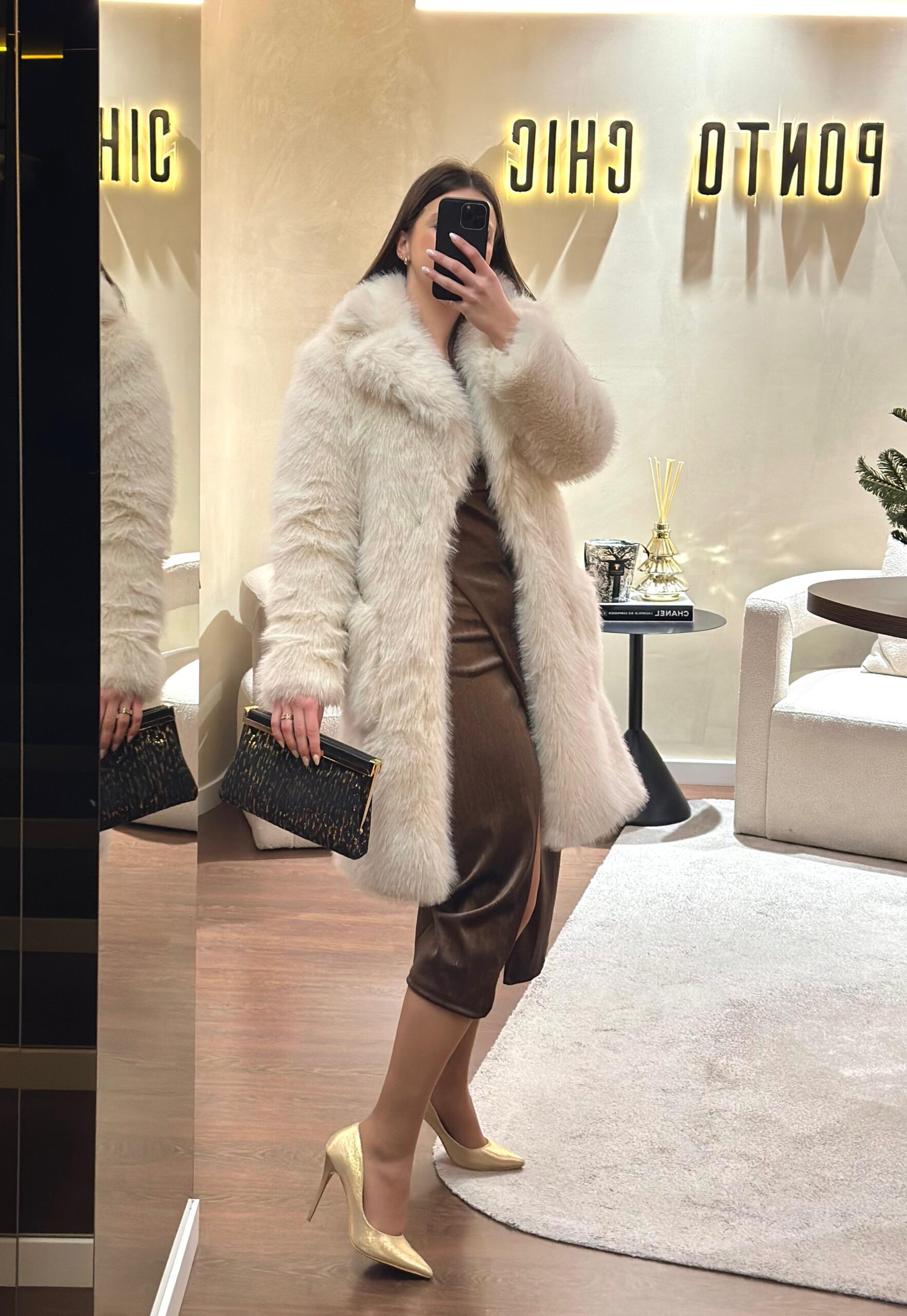 O design apresenta um corte elegante e alongado, perfeito para criar uma silhueta envolvente e feminina. O pelo de textura densa e sedosa dá presença à peça sem pesar, enquanto os bolsos laterais integrados acrescentam funcionalidade no dia a dia, mantendo a linha clean.