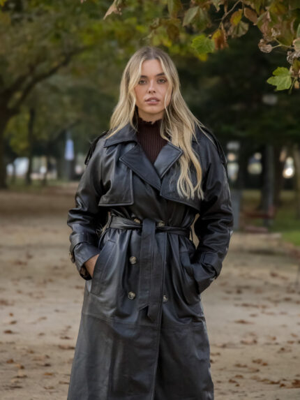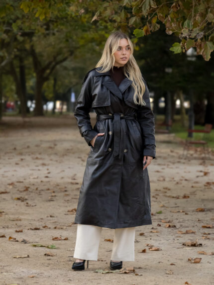 O modelo apresenta gola alta que pode ser usada aberta ou levantada, fecho frontal com botões metálicos e dois bolsos laterais práticos. As mangas com presilha e botão acrescentam um detalhe subtil de sofisticação, mantendo a silhueta fluida e moderna.