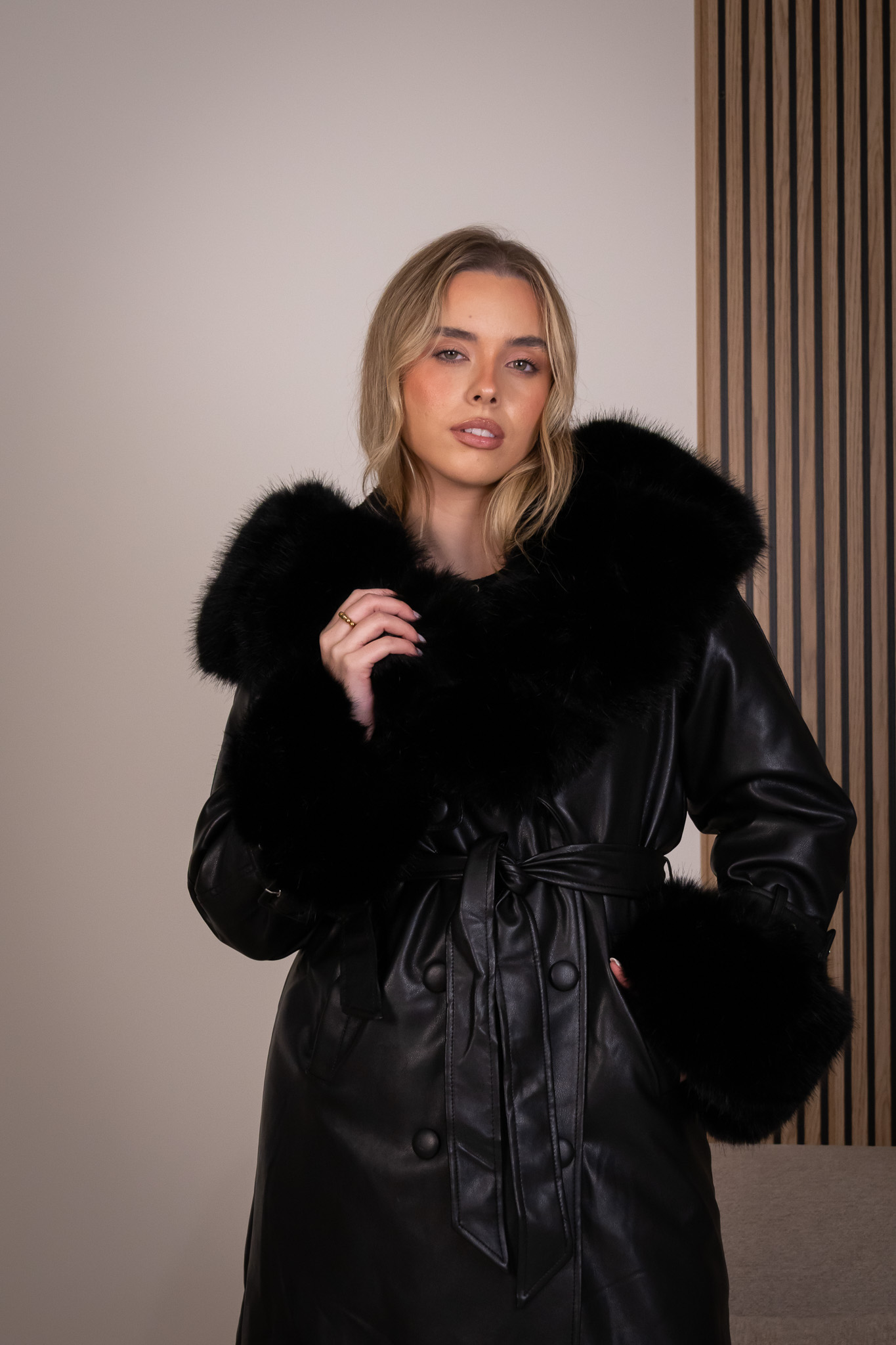 CASACO COMPRIDO PRETO EM ECOPELE E PELO PONTO CHIC