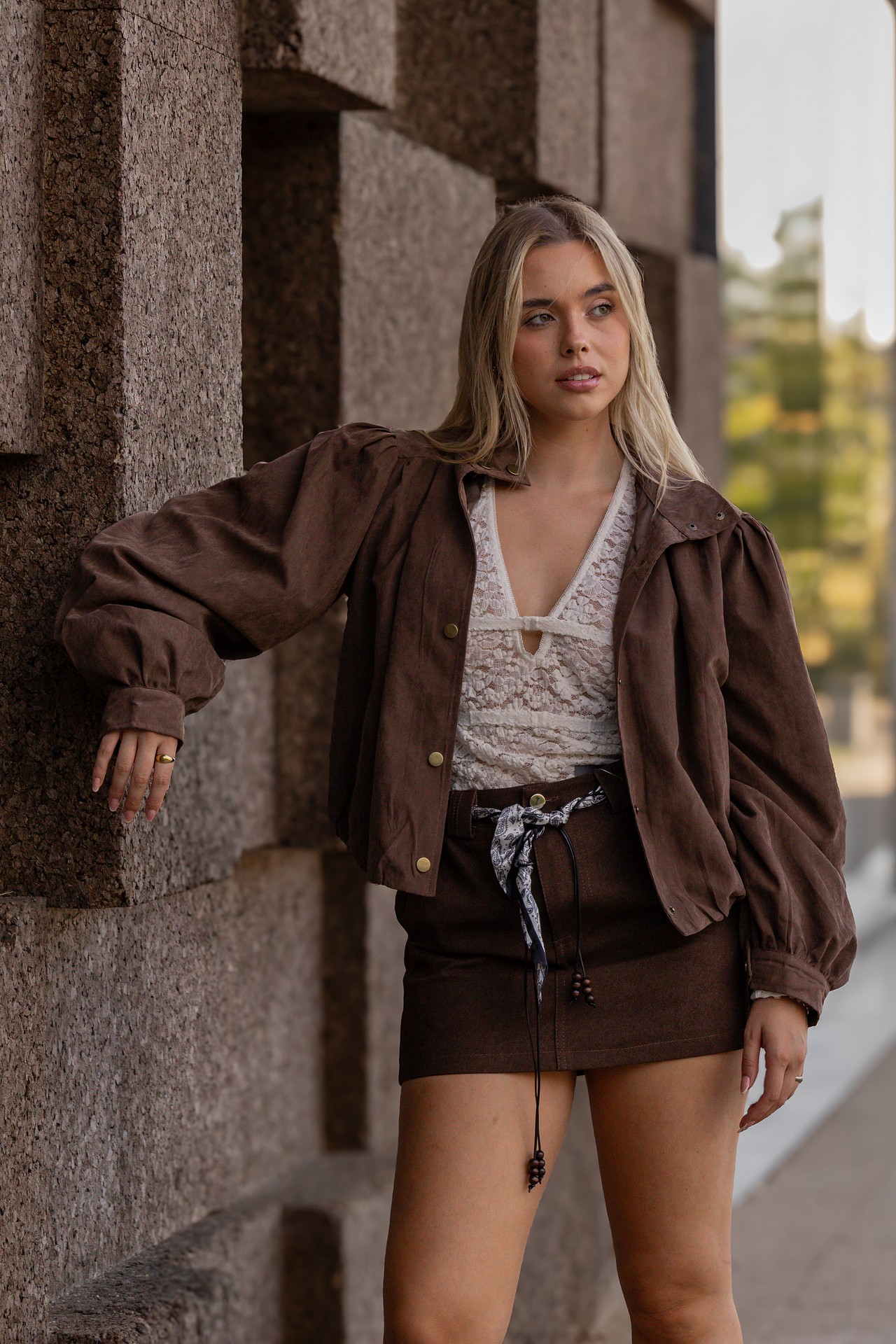 CASACO CURTO CASTANHO EM CAMURÇA SINTÉTICA PONTO CHIC