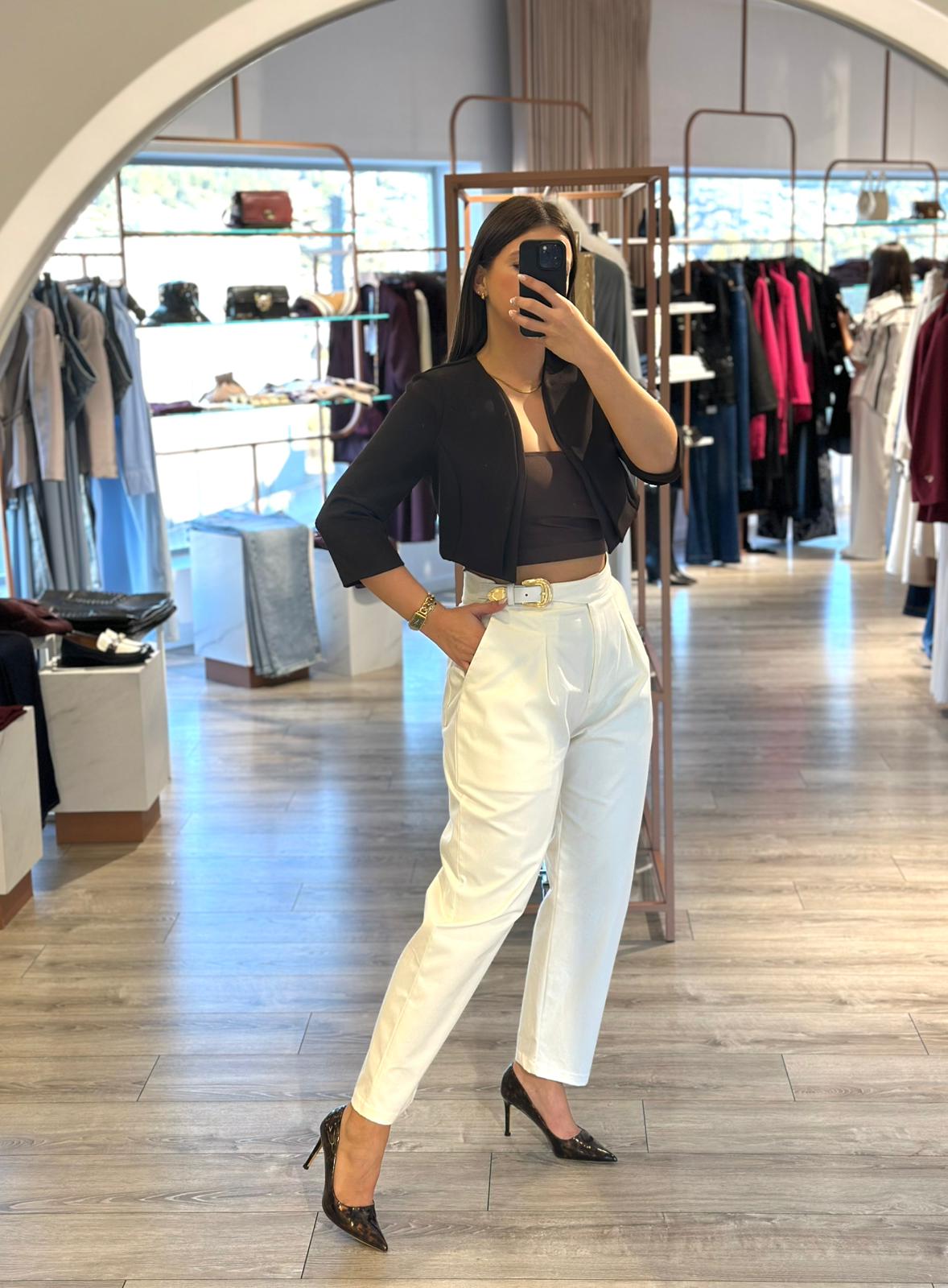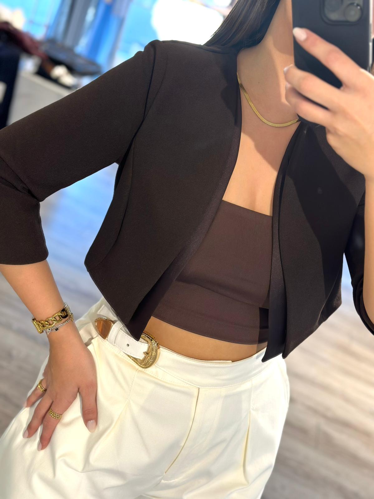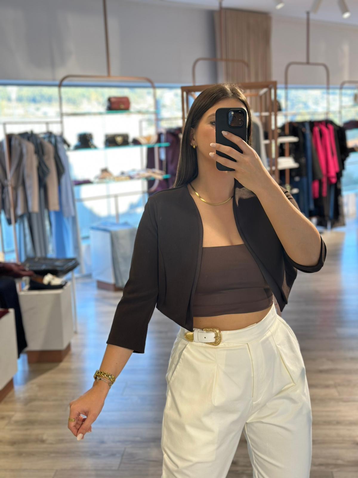 Com modelagem cropped, mangas a 3/4 e recorte estruturado, este casaco destaca-se pela silhueta moderna que valoriza qualquer coordenado. Ideal para usar sobre vestidos em ocasiões especiais ou para elevar produções mais simples, é uma peça versátil e intemporal.