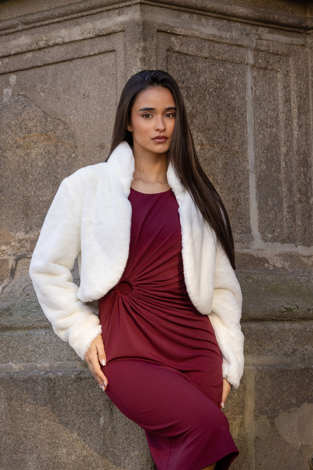 O design distingue-se pelo pêlo sintético suave, pela gola envolvente e pela aplicação joia decorativa na frente, que acrescenta um apontamento refinado e feminino. O corte curto valoriza a silhueta e torna esta peça perfeita para conjugar com vestidos, coordenados de festa ou looks mais elegantes de inverno.