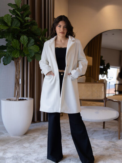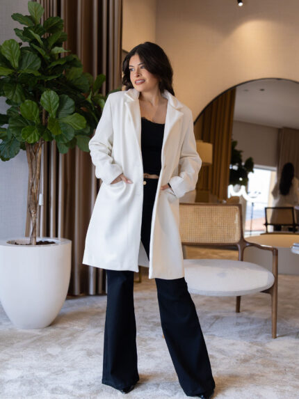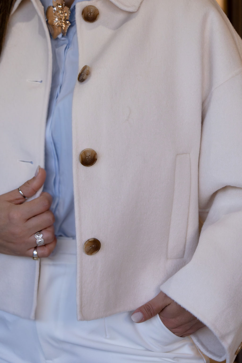 Este casaco curto em tom cru destaca-se pela sua elegância intemporal e estética sofisticada, sendo uma peça luminosa e refinada que eleva qualquer look. A gola clássica estruturada confere-lhe um acabamento cuidado e feminino, enquanto os botões forrados acrescentam um detalhe delicado e harmonioso, reforçando o carácter premium da peça.