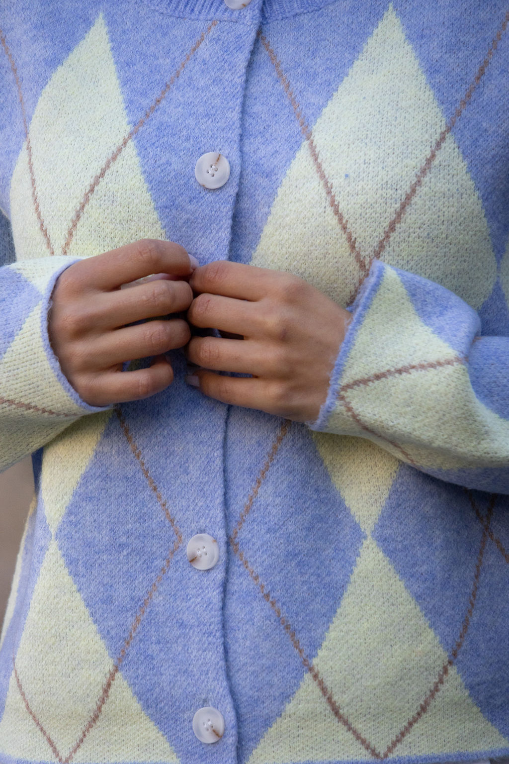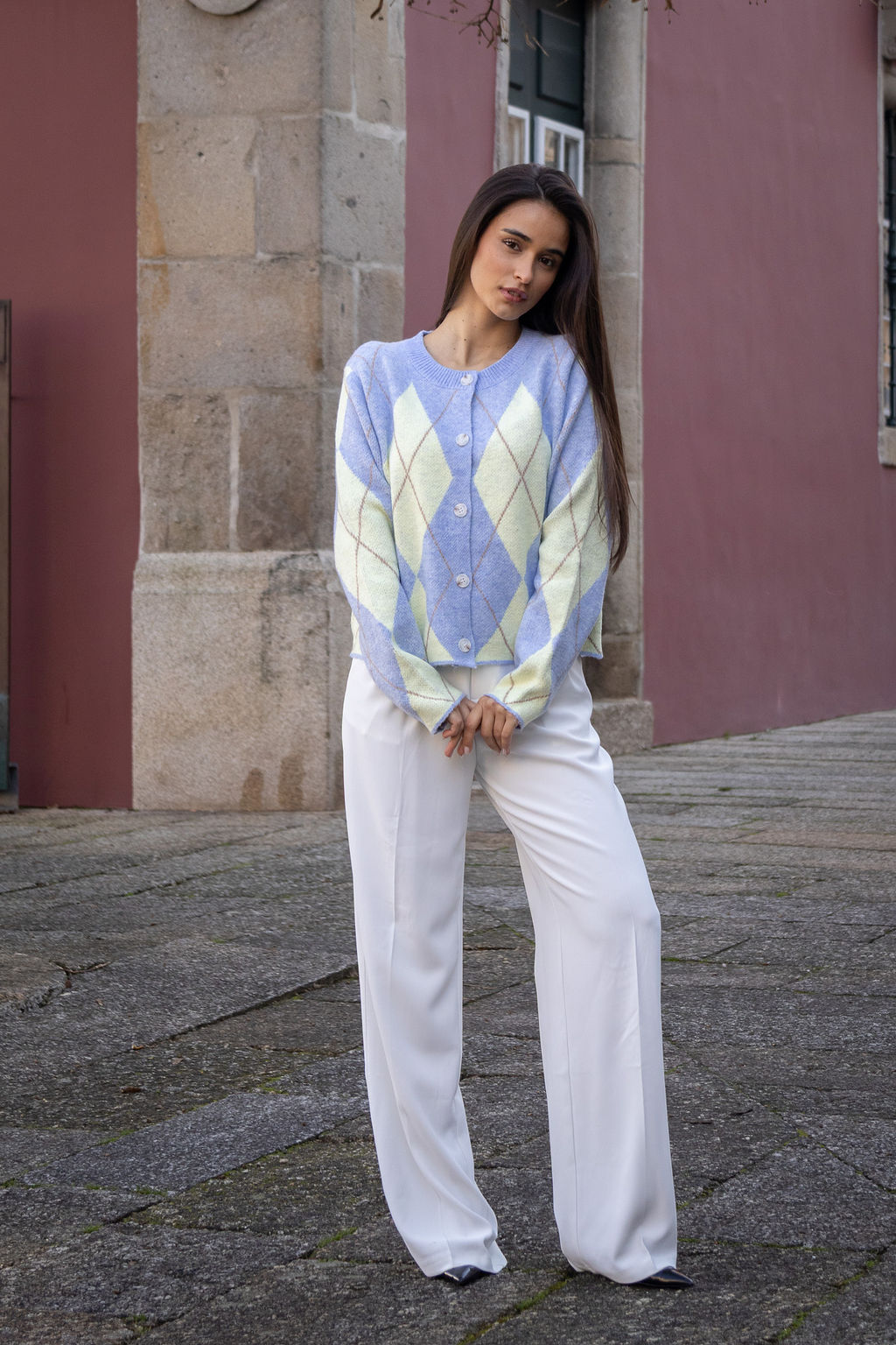 O design de decote redondo com fecho frontal de botões cria uma silhueta simples e intemporal, fácil de vestir e de conjugar. O padrão de losangos em contraste acrescenta personalidade à peça, mantendo um visual delicado e harmonioso.