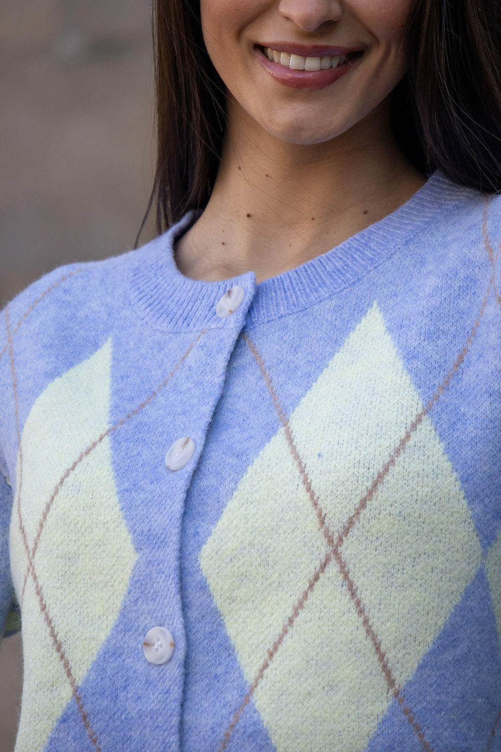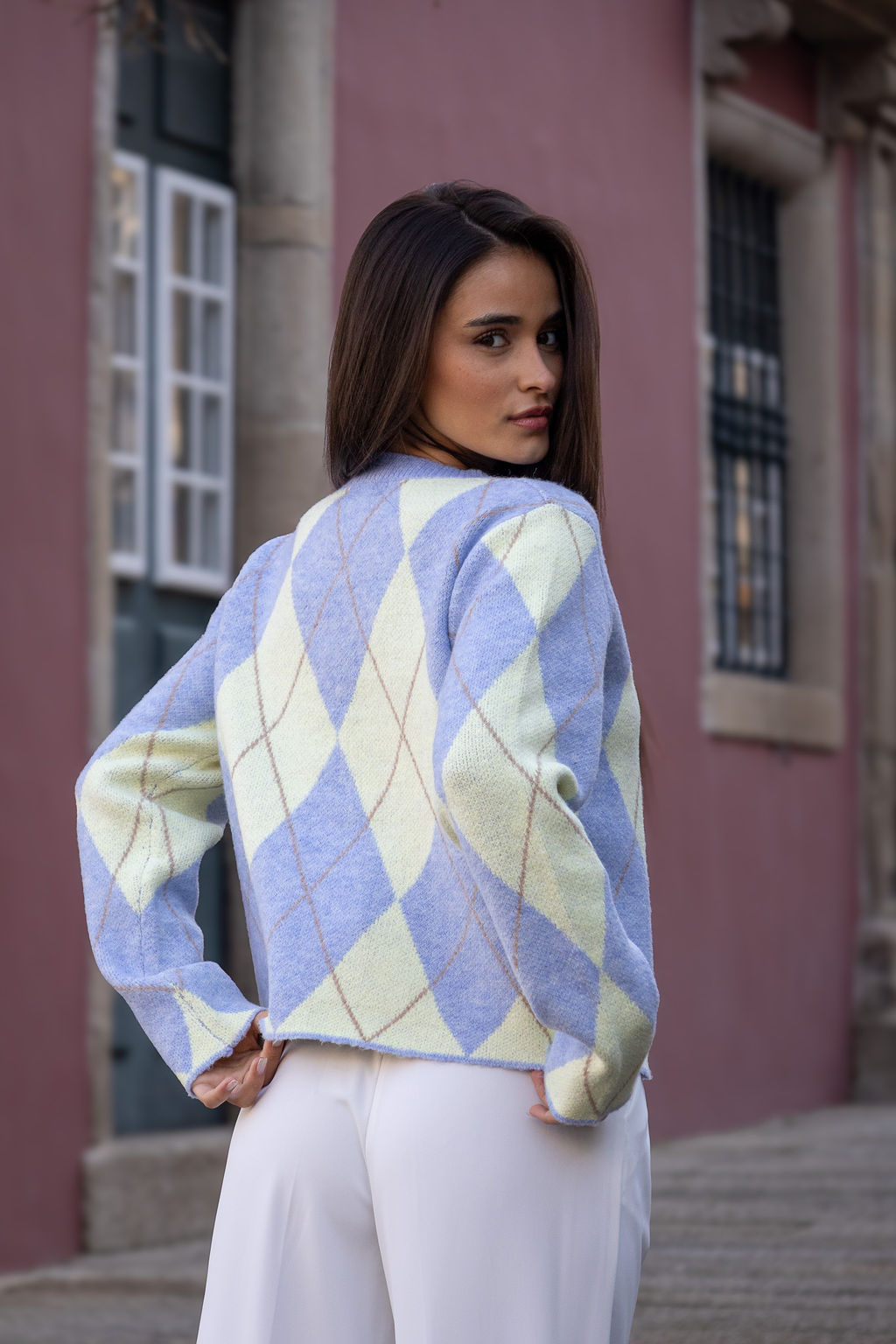 CASACO DE MALHA AZUL BEBÉ COM PADRÃO DE LOSANGOS PONTO CHIC
